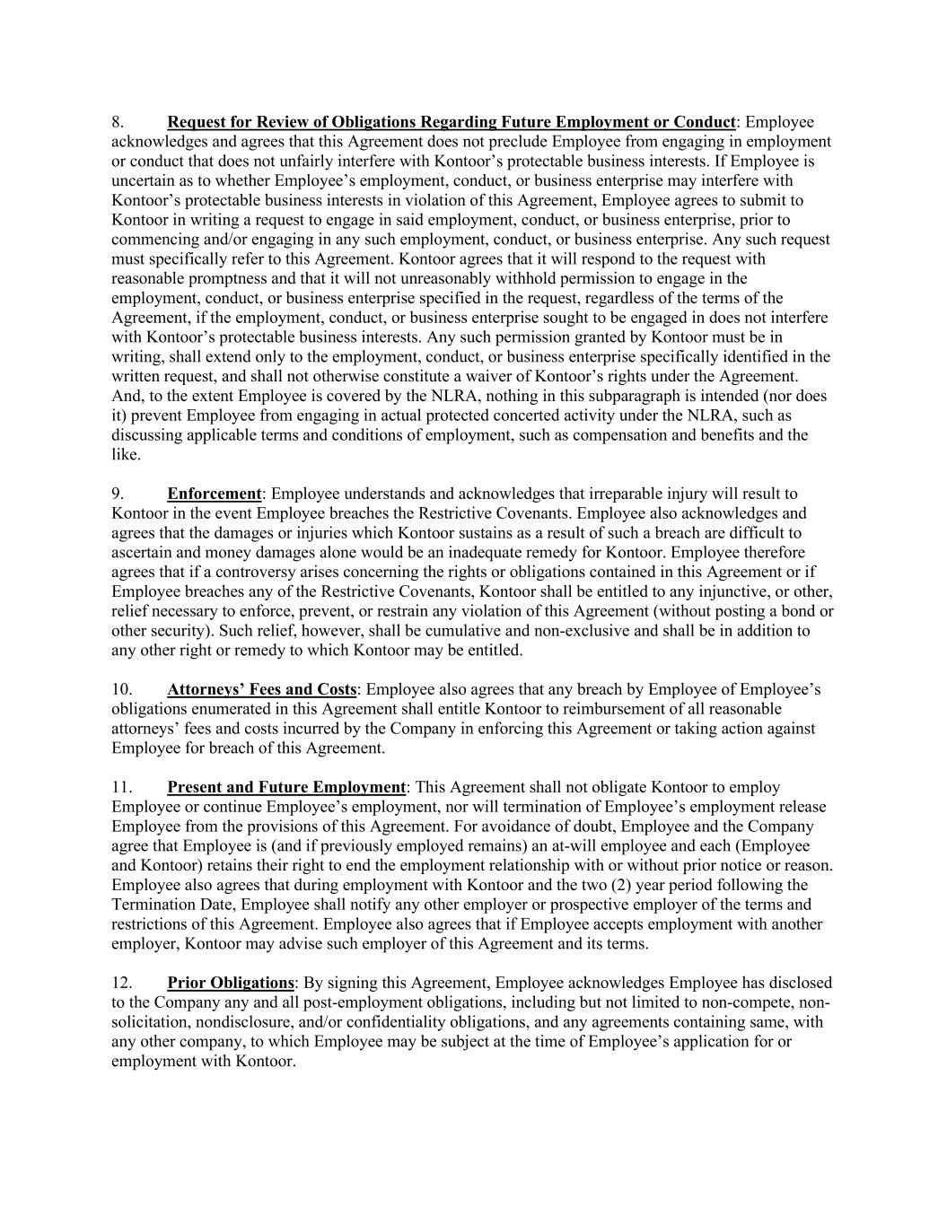 8. Request for Review of Obligations Regarding Future Employment or Conduct: Employee acknowledges and agrees that this Agreement does not preclude Employee from engaging in employment or conduct that does not unfairly interfere with Kontoor’s protectable business interests. If Employee is uncertain as to whether Employee’s employment, conduct, or business enterprise may interfere with Kontoor’s protectable business interests in violation of this Agreement, Employee agrees to submit to Kontoor in writing a request to engage in said employment, conduct, or business enterprise, prior to commencing and/or engaging in any such employment, conduct, or business enterprise. Any such request must specifically refer to this Agreement. Kontoor agrees that it will respond to the request with reasonable promptness and that it will not unreasonably withhold permission to engage in the employment, conduct, or business enterprise specified in the request, regardless of the terms of the Agreement, if the employment, conduct, or business enterprise sought to be engaged in does not interfere with Kontoor’s protectable business interests. Any such permission granted by Kontoor must be in writing, shall extend only to the employment, conduct, or business enterprise specifically identified in the written request, and shall not otherwise constitute a waiver of Kontoor’s rights under the Agreement. And, to the extent Employee is covered by the NLRA, nothing in this subparagraph is intended (nor does it) prevent Employee from engaging in actual protected concerted activity under the NLRA, such as discussing applicable terms and conditions of employment, such as compensation and benefits and the like. 9. Enforcement: Employee understands and acknowledges that irreparable injury will result to Kontoor in the event Employee breaches the Restrictive Covenants. Employee also acknowledges and agrees that the damages or injuries which Kontoor sustains as a result of such a breach are difficult to ascertain and money damages alone would be an inadequate remedy for Kontoor. Employee therefore agrees that if a controversy arises concerning the rights or obligations contained in this Agreement or if Employee breaches any of the Restrictive Covenants, Kontoor shall be entitled to any injunctive, or other, relief necessary to enforce, prevent, or restrain any violation of this Agreement (without posting a bond or other security). Such relief, however, shall be cumulative and non-exclusive and shall be in addition to any other right or remedy to which Kontoor may be entitled. 10. Attorneys’ Fees and Costs: Employee also agrees that any breach by Employee of Employee’s obligations enumerated in this Agreement shall entitle Kontoor to reimbursement of all reasonable attorneys’ fees and costs incurred by the Company in enforcing this Agreement or taking action against Employee for breach of this Agreement. 11. Present and Future Employment: This Agreement shall not obligate Kontoor to employ Employee or continue Employee’s employment, nor will termination of Employee’s employment release Employee from the provisions of this Agreement. For avoidance of doubt, Employee and the Company agree that Employee is (and if previously employed remains) an at-will employee and each (Employee and Kontoor) retains their right to end the employment relationship with or without prior notice or reason. Employee also agrees that during employment with Kontoor and the two (2) year period following the Termination Date, Employee shall notify any other employer or prospective employer of the terms and restrictions of this Agreement. Employee also agrees that if Employee accepts employment with another employer, Kontoor may advise such employer of this Agreement and its terms. 12. Prior Obligations: By signing this Agreement, Employee acknowledges Employee has disclosed to the Company any and all post-employment obligations, including but not limited to non-compete, non- solicitation, nondisclosure, and/or confidentiality obligations, and any agreements containing same, with any other company, to which Employee may be subject at the time of Employee’s application for or employment with Kontoor.