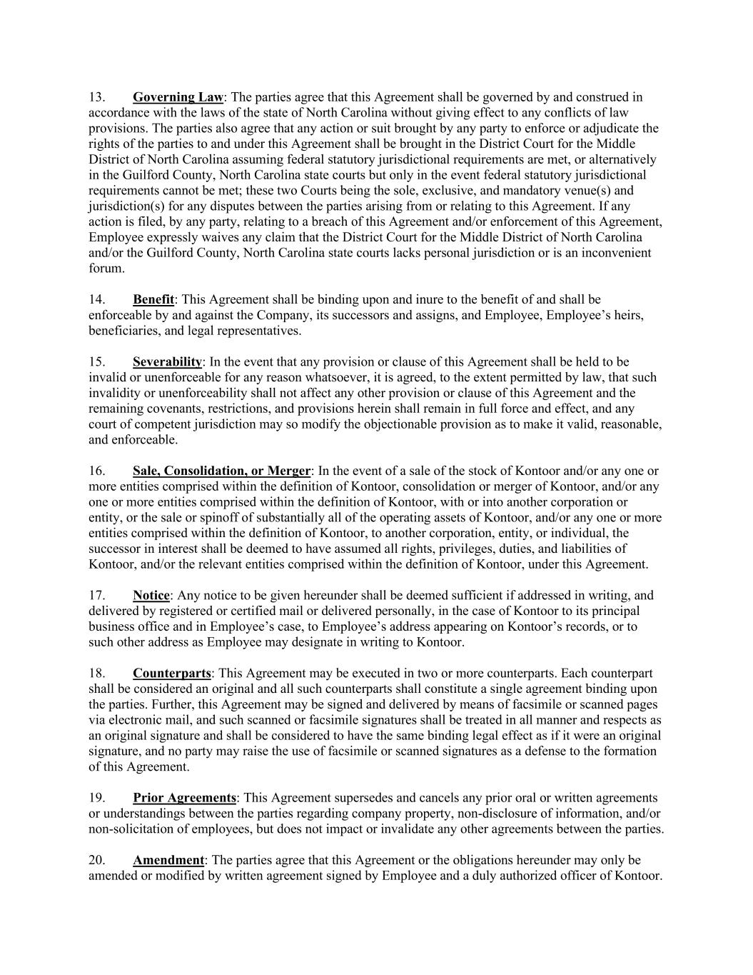 13. Governing Law: The parties agree that this Agreement shall be governed by and construed in accordance with the laws of the state of North Carolina without giving effect to any conflicts of law provisions. The parties also agree that any action or suit brought by any party to enforce or adjudicate the rights of the parties to and under this Agreement shall be brought in the District Court for the Middle District of North Carolina assuming federal statutory jurisdictional requirements are met, or alternatively in the Guilford County, North Carolina state courts but only in the event federal statutory jurisdictional requirements cannot be met; these two Courts being the sole, exclusive, and mandatory venue(s) and jurisdiction(s) for any disputes between the parties arising from or relating to this Agreement. If any action is filed, by any party, relating to a breach of this Agreement and/or enforcement of this Agreement, Employee expressly waives any claim that the District Court for the Middle District of North Carolina and/or the Guilford County, North Carolina state courts lacks personal jurisdiction or is an inconvenient forum. 14. Benefit: This Agreement shall be binding upon and inure to the benefit of and shall be enforceable by and against the Company, its successors and assigns, and Employee, Employee’s heirs, beneficiaries, and legal representatives. 15. Severability: In the event that any provision or clause of this Agreement shall be held to be invalid or unenforceable for any reason whatsoever, it is agreed, to the extent permitted by law, that such invalidity or unenforceability shall not affect any other provision or clause of this Agreement and the remaining covenants, restrictions, and provisions herein shall remain in full force and effect, and any court of competent jurisdiction may so modify the objectionable provision as to make it valid, reasonable, and enforceable. 16. Sale, Consolidation, or Merger: In the event of a sale of the stock of Kontoor and/or any one or more entities comprised within the definition of Kontoor, consolidation or merger of Kontoor, and/or any one or more entities comprised within the definition of Kontoor, with or into another corporation or entity, or the sale or spinoff of substantially all of the operating assets of Kontoor, and/or any one or more entities comprised within the definition of Kontoor, to another corporation, entity, or individual, the successor in interest shall be deemed to have assumed all rights, privileges, duties, and liabilities of Kontoor, and/or the relevant entities comprised within the definition of Kontoor, under this Agreement. 17. Notice: Any notice to be given hereunder shall be deemed sufficient if addressed in writing, and delivered by registered or certified mail or delivered personally, in the case of Kontoor to its principal business office and in Employee’s case, to Employee’s address appearing on Kontoor’s records, or to such other address as Employee may designate in writing to Kontoor. 18. Counterparts: This Agreement may be executed in two or more counterparts. Each counterpart shall be considered an original and all such counterparts shall constitute a single agreement binding upon the parties. Further, this Agreement may be signed and delivered by means of facsimile or scanned pages via electronic mail, and such scanned or facsimile signatures shall be treated in all manner and respects as an original signature and shall be considered to have the same binding legal effect as if it were an original signature, and no party may raise the use of facsimile or scanned signatures as a defense to the formation of this Agreement. 19. Prior Agreements: This Agreement supersedes and cancels any prior oral or written agreements or understandings between the parties regarding company property, non-disclosure of information, and/or non-solicitation of employees, but does not impact or invalidate any other agreements between the parties. 20. Amendment: The parties agree that this Agreement or the obligations hereunder may only be amended or modified by written agreement signed by Employee and a duly authorized officer of Kontoor.