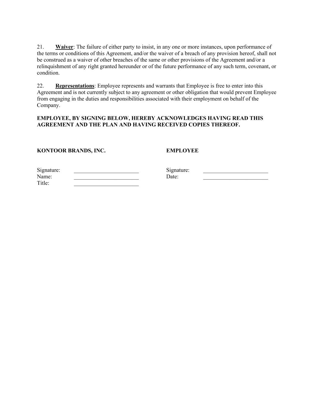 21. Waiver: The failure of either party to insist, in any one or more instances, upon performance of the terms or conditions of this Agreement, and/or the waiver of a breach of any provision hereof, shall not be construed as a waiver of other breaches of the same or other provisions of the Agreement and/or a relinquishment of any right granted hereunder or of the future performance of any such term, covenant, or condition. 22. Representations: Employee represents and warrants that Employee is free to enter into this Agreement and is not currently subject to any agreement or other obligation that would prevent Employee from engaging in the duties and responsibilities associated with their employment on behalf of the Company. EMPLOYEE, BY SIGNING BELOW, HEREBY ACKNOWLEDGES HAVING READ THIS AGREEMENT AND THE PLAN AND HAVING RECEIVED COPIES THEREOF. KONTOOR BRANDS, INC. EMPLOYEE Signature: _______________________ Signature: _______________________ Name: _______________________ Date: _______________________ Title: _______________________