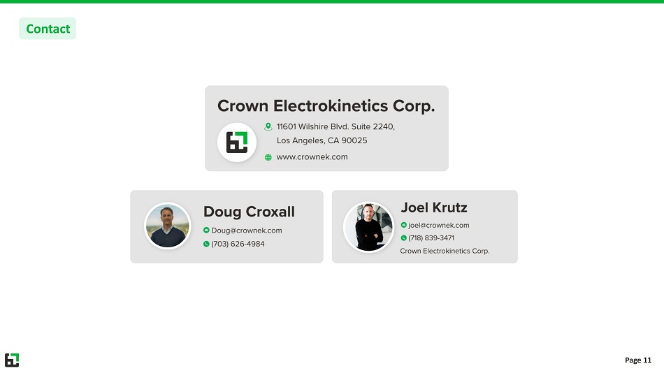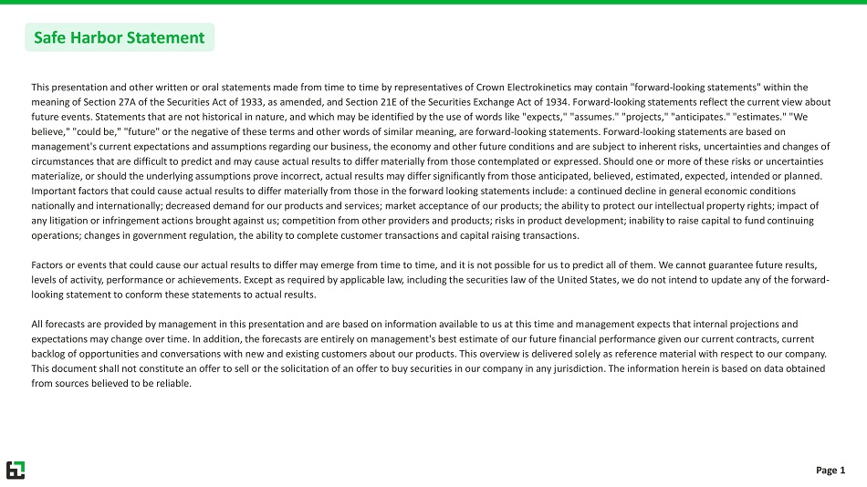 This presentation and other written or oral statements made from time to time by representatives of Crown Electrokinetics may co ntain "forward - looking statements" within the meaning of Section 27A of the Securities Act of 1933, as amended, and Section 21E of the Securities Exchange Act of 1934. For war d - looking statements reflect the current view about future events. Statements that are not historical in nature, and which may be identified by the use of words like "expects," "as sumes." "projects," "anticipates." "estimates." "We believe," "could be," "future" or the negative of these terms and other words of similar meaning, are forward - looking statements . Forward - looking statements are based on management's current expectations and assumptions regarding our business, the economy and other future conditions and are sub jec t to inherent risks, uncertainties and changes of circumstances that are difficult to predict and may cause actual results to differ materially from those contemplated or expr ess ed. Should one or more of these risks or uncertainties materialize, or should the underlying assumptions prove incorrect, actual results may differ significantly from those anticip ate d, believed, estimated, expected, intended or planned. Important factors that could cause actual results to differ materially from those in the forward looking statements include: a c ontinued decline in general economic conditions nationally and internationally; decreased demand for our products and services; market acceptance of our products; the abilit y t o protect our intellectual property rights; impact of any litigation or infringement actions brought against us; competition from other providers and products; risks in product de vel opment; inability to raise capital to fund continuing operations; changes in government regulation, the ability to complete customer transactions and capital raising transactions. Factors or events that could cause our actual results to differ may emerge from time to time, and it is not possible for us t o p redict all of them. We cannot guarantee future results, levels of activity, performance or achievements. Except as required by applicable law, including the securities law of the Un ite d States, we do not intend to update any of the forward - looking statement to conform these statements to actual results. All forecasts are provided by management in this presentation and are based on information available to us at this time and m ana gement expects that internal projections and expectations may change over time. In addition, the forecasts are entirely on management's best estimate of our future financ ial performance given our current contracts, current backlog of opportunities and conversations with new and existing customers about our products. This overview is delivered sol ely as reference material with respect to our company. This document shall not constitute an offer to sell or the solicitation of an offer to buy securities in our company in any j uri sdiction. The information herein is based on data obtained from sources believed to be reliable. Safe Harbor Statement Page 1