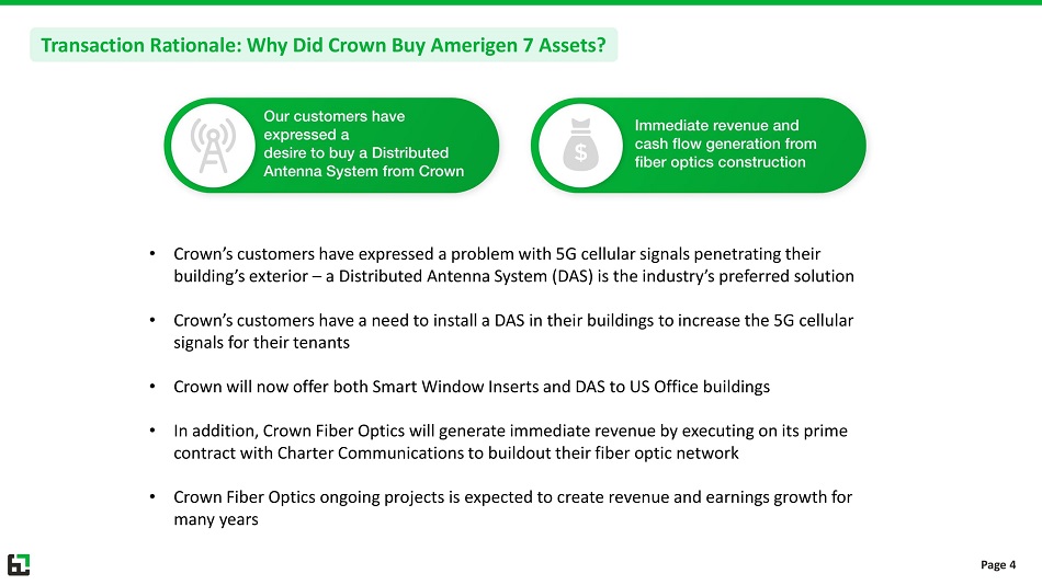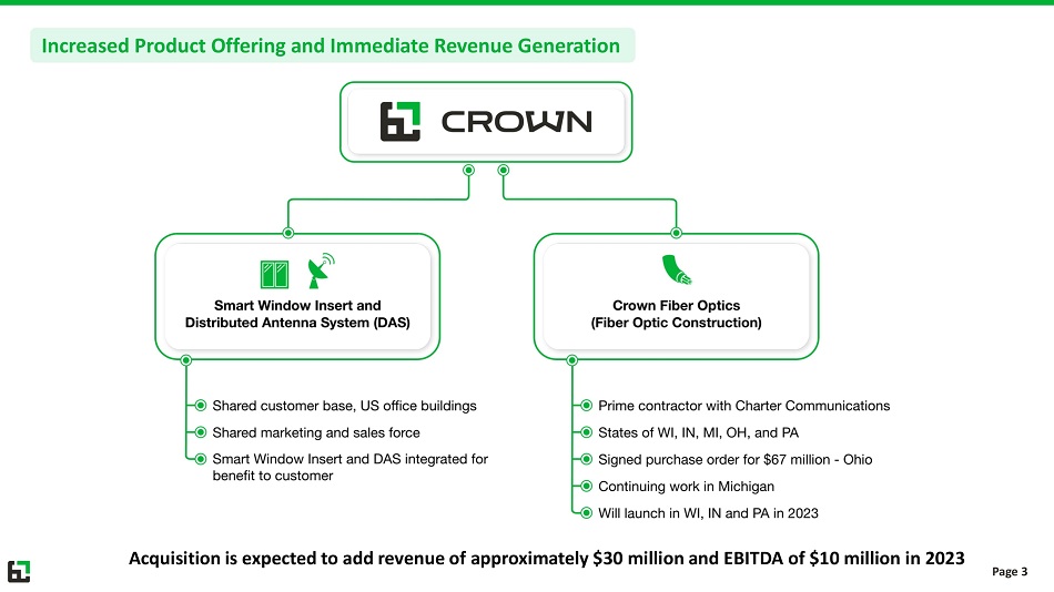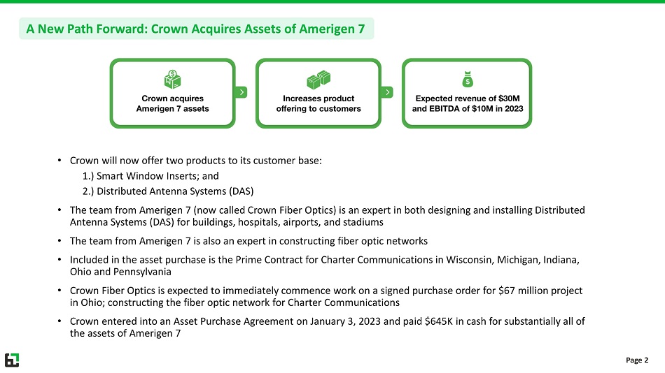 • Crown will now offer two products to its customer base: 1.) Smart Window Inserts; and 2.) Distributed Antenna Systems (DAS) • The team from Amerigen 7 (now called Crown Fiber Optics) is an expert in both designing and installing Distributed Antenna Systems (DAS) for buildings, hospitals, airports, and stadiums • The team from Amerigen 7 is also an expert in constructing fiber optic networks • Included in the asset purchase is the Prime Contract for Charter Communications in Wisconsin, Michigan, Indiana, Ohio and Pennsylvania • Crown Fiber Optics is expected to immediately commence work on a signed purchase order for $67 million project in Ohio; constructing the fiber optic network for Charter Communications • Crown entered into an Asset Purchase Agreement on January 3, 2023 and paid $645K in cash for substantially all of the assets of Amerigen 7 A New Path Forward: Crown Acquires Assets of Amerigen 7 Page 2