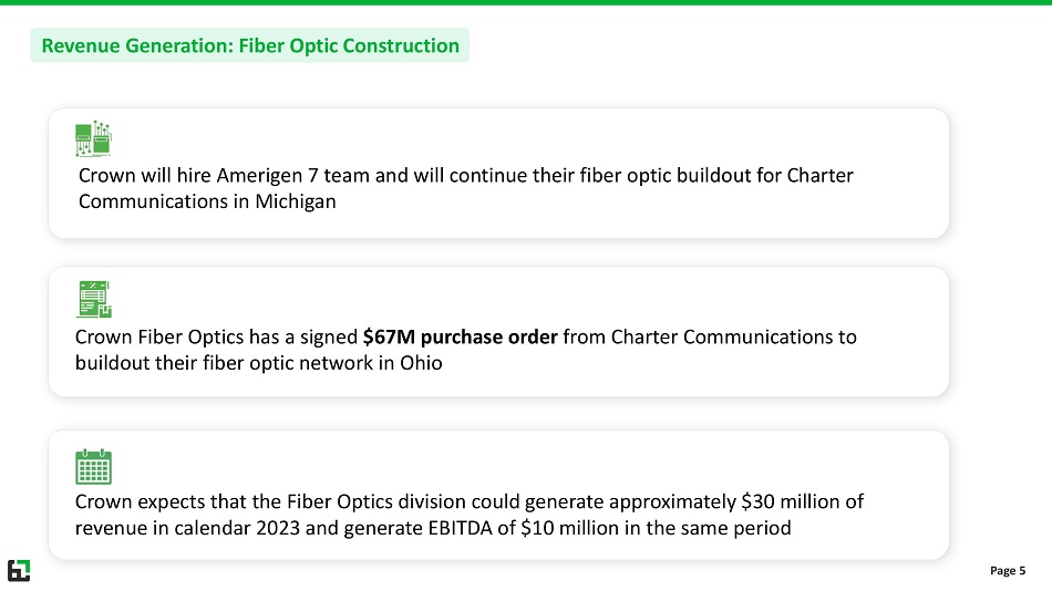 • Crown’s customers have expressed a problem with 5G cellular signals penetrating their building’s exterior – a Distributed Antenna System (DAS) is the industry’s preferred solution • Crown’s customers have a need to install a DAS in their buildings to increase the 5G cellular signals for their tenants • Crown will now offer both Smart Window Inserts and DAS to US Office buildings • In addition, Crown Fiber Optics will generate immediate revenue by executing on its prime contract with Charter Communications to buildout their fiber optic network • Crown Fiber Optics ongoing projects is expected to create revenue and earnings growth for many years Transaction Rationale: Why Did Crown Buy Amerigen 7 Assets? Page 4