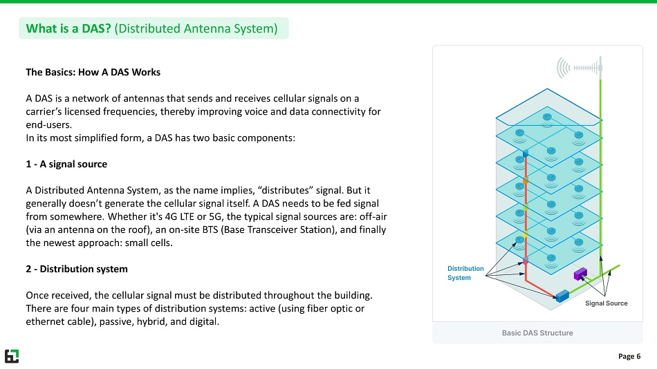 The Basics: How A DAS Works A DAS is a network of antennas that sends and receives cellular signals on a carrier’s licensed frequencies, thereby improving voice and data connectivity for end - users. In its most simplified form, a DAS has two basic components: 1 - A signal source A Distributed Antenna System, as the name implies, “distributes” signal. But it generally doesn’t generate the cellular signal itself. A DAS needs to be fed signal from somewhere. Whether it's 4G LTE or 5G, the typical signal sources are: off - air (via an antenna on the roof), an on - site BTS (Base Transceiver Station), and finally the newest approach: small cells. 2 - Distribution system Once received, the cellular signal must be distributed throughout the building. There are four main types of distribution systems: active (using fiber optic or ethernet cable), passive, hybrid, and digital. What is a DAS? (Distributed Antenna System) Page 6