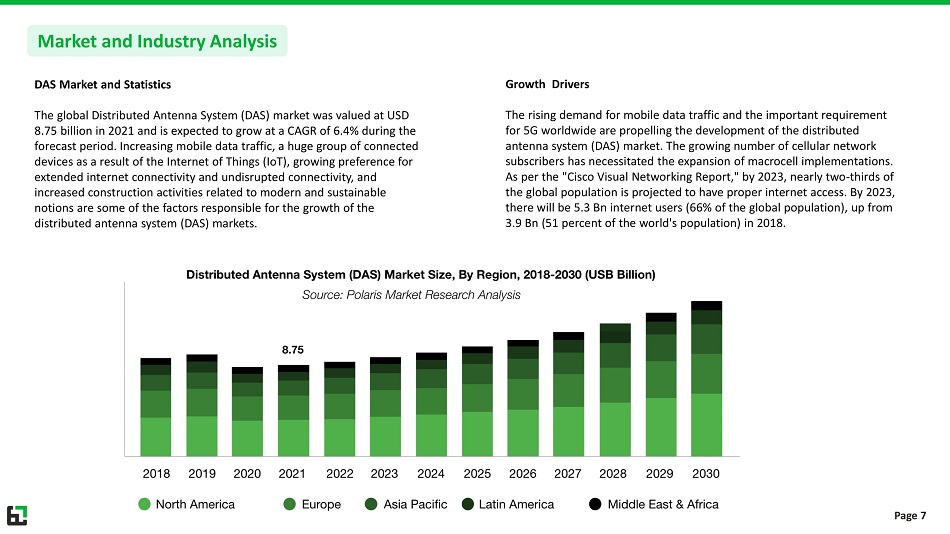 DAS Market and Statistics The global Distributed Antenna System (DAS) market was valued at USD 8.75 billion in 2021 and is expected to grow at a CAGR of 6.4% during the forecast period. Increasing mobile data traffic, a huge group of connected devices as a result of the Internet of Things (IoT), growing preference for extended internet connectivity and undisrupted connectivity, and increased construction activities related to modern and sustainable notions are some of the factors responsible for the growth of the distributed antenna system (DAS) markets. Market and Industry Analysis Growth Drivers The rising demand for mobile data traffic and the important requirement for 5G worldwide are propelling the development of the distributed antenna system (DAS) market. The growing number of cellular network subscribers has necessitated the expansion of macrocell implementations. As per the "Cisco Visual Networking Report," by 2023, nearly two - thirds of the global population is projected to have proper internet access. By 2023, there will be 5.3 Bn internet users (66% of the global population), up from 3.9 Bn (51 percent of the world's population) in 2018. Page 7