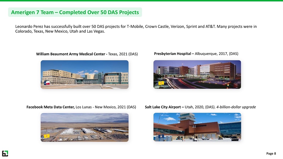Leonardo Perez has successfully built over 50 DAS projects for T - Mobile, Crown Castle, Verizon, Sprint and AT&T. Many projects w ere in Colorado, Texas, New Mexico, Utah and Las Vegas. William Beaumont Army Medical Center - Texas, 2021 (DAS) Facebook Meta Data Center, Los Lunas - New Mexico, 2021 (DAS) Presbyterian Hospital – Albuquerque, 2017, (DAS) Salt Lake City Airport – Utah, 2020, (DAS). 4 - billion - dollar upgrade Amerigen 7 Team – Completed Over 50 DAS Projects Page 8
