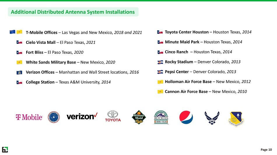 T - Mobile Offices – Las Vegas and New Mexico, 2018 and 2021 Cielo Vista Mall – El Paso Texas, 2021 Fort Bliss – El Paso Texas, 2020 White Sands Military Base – New Mexico, 2020 Verizon Offices – Manhattan and Wall Street locations, 2016 College Station – Texas A&M University, 2014 Additional Distributed Antenna System Installations Toyota Center Houston – Houston Texas, 2014 Minute Maid Park – Houston Texas, 2014 Cinco Ranch – Houston Texas, 2014 Rocky Stadium – Denver Colorado, 2013 Pepsi Center – Denver Colorado, 2013 Holloman Air Force Base – New Mexico, 2012 Cannon Air Force Base – New Mexico, 2010 Page 10