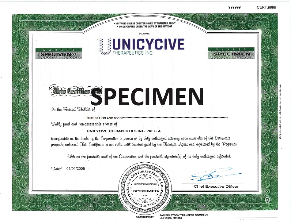 EX-4.1 3 ea174702ex4-1_unicycive.htm FORM OF SPECIMEN STOCK CERTIFICATE FOR SERIES A-1 PREFERRED STOCK