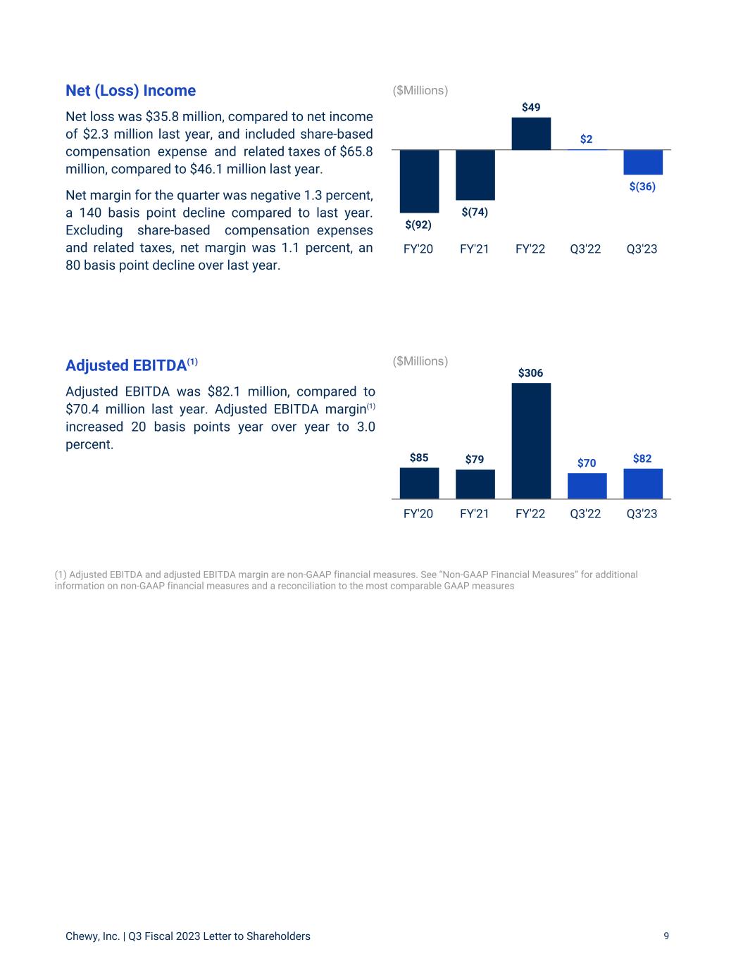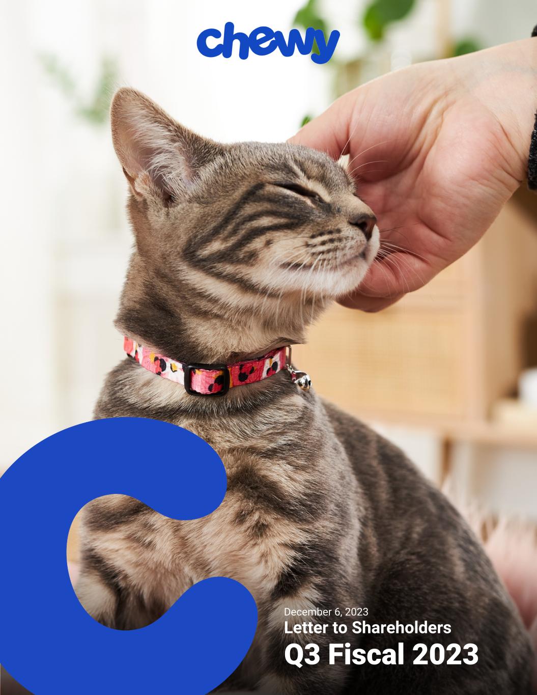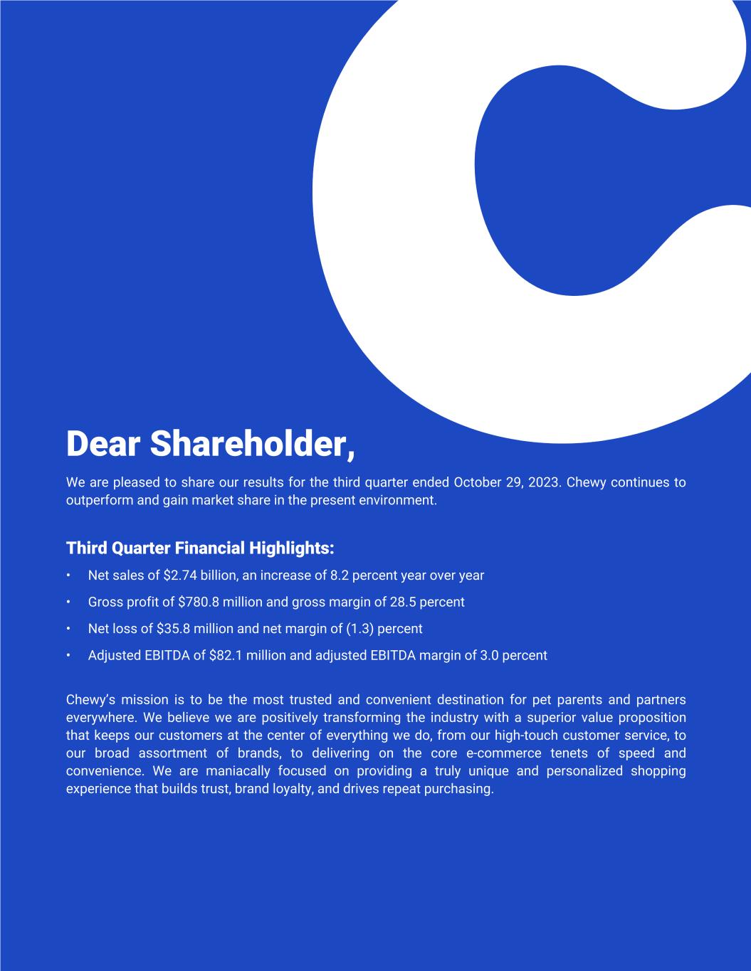 Dear Shareholder, We are pleased to share our results for the third quarter ended October 29, 2023. Chewy continues to outperform and gain market share in the present environment. Third Quarter Financial Highlights: • Net sales of $2.74 billion, an increase of 8.2 percent year over year • Gross profit of $780.8 million and gross margin of 28.5 percent • Net loss of $35.8 million and net margin of (1.3) percent • Adjusted EBITDA of $82.1 million and adjusted EBITDA margin of 3.0 percent Chewy’s mission is to be the most trusted and convenient destination for pet parents and partners everywhere. We believe we are positively transforming the industry with a superior value proposition that keeps our customers at the center of everything we do, from our high-touch customer service, to our broad assortment of brands, to delivering on the core e-commerce tenets of speed and convenience. We are maniacally focused on providing a truly unique and personalized shopping experience that builds trust, brand loyalty, and drives repeat purchasing.