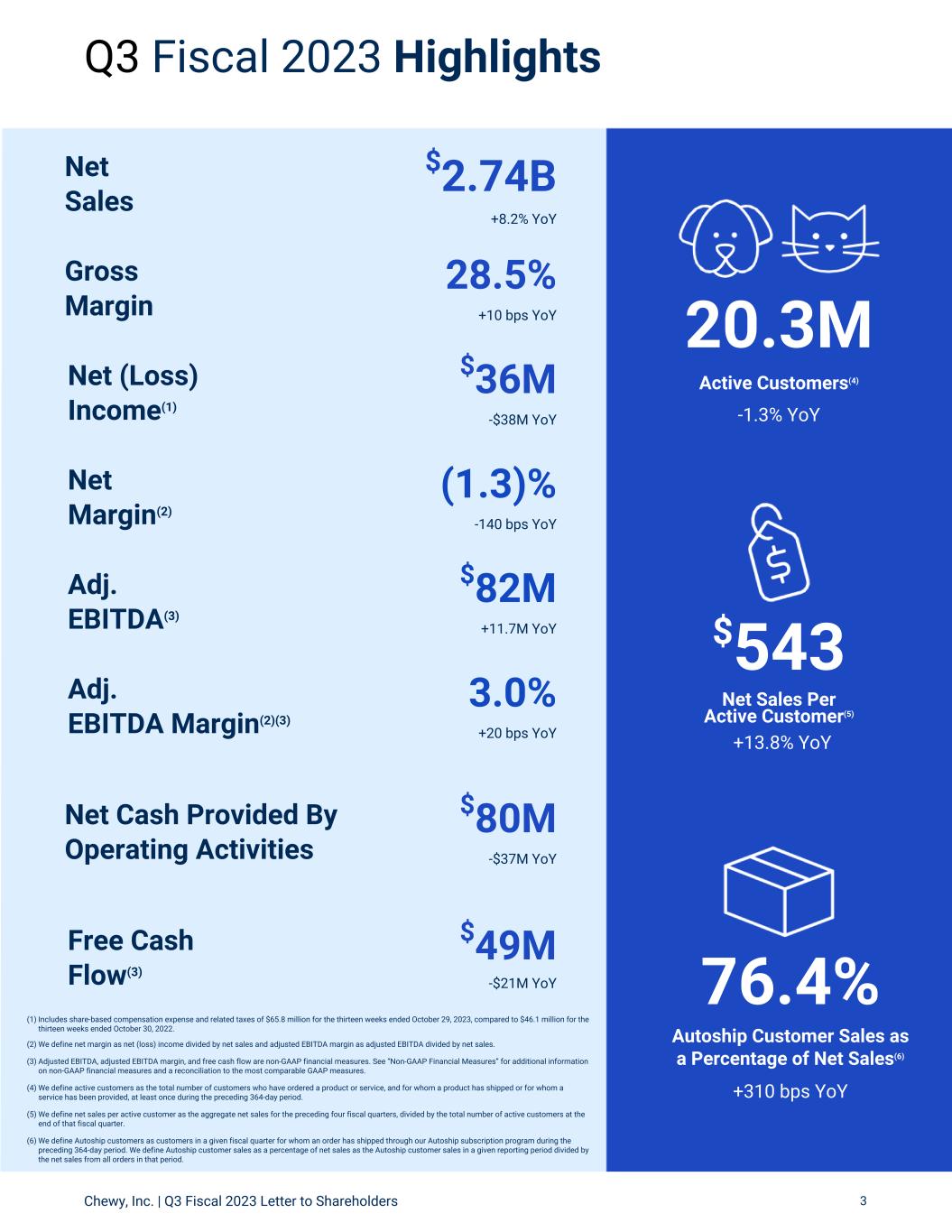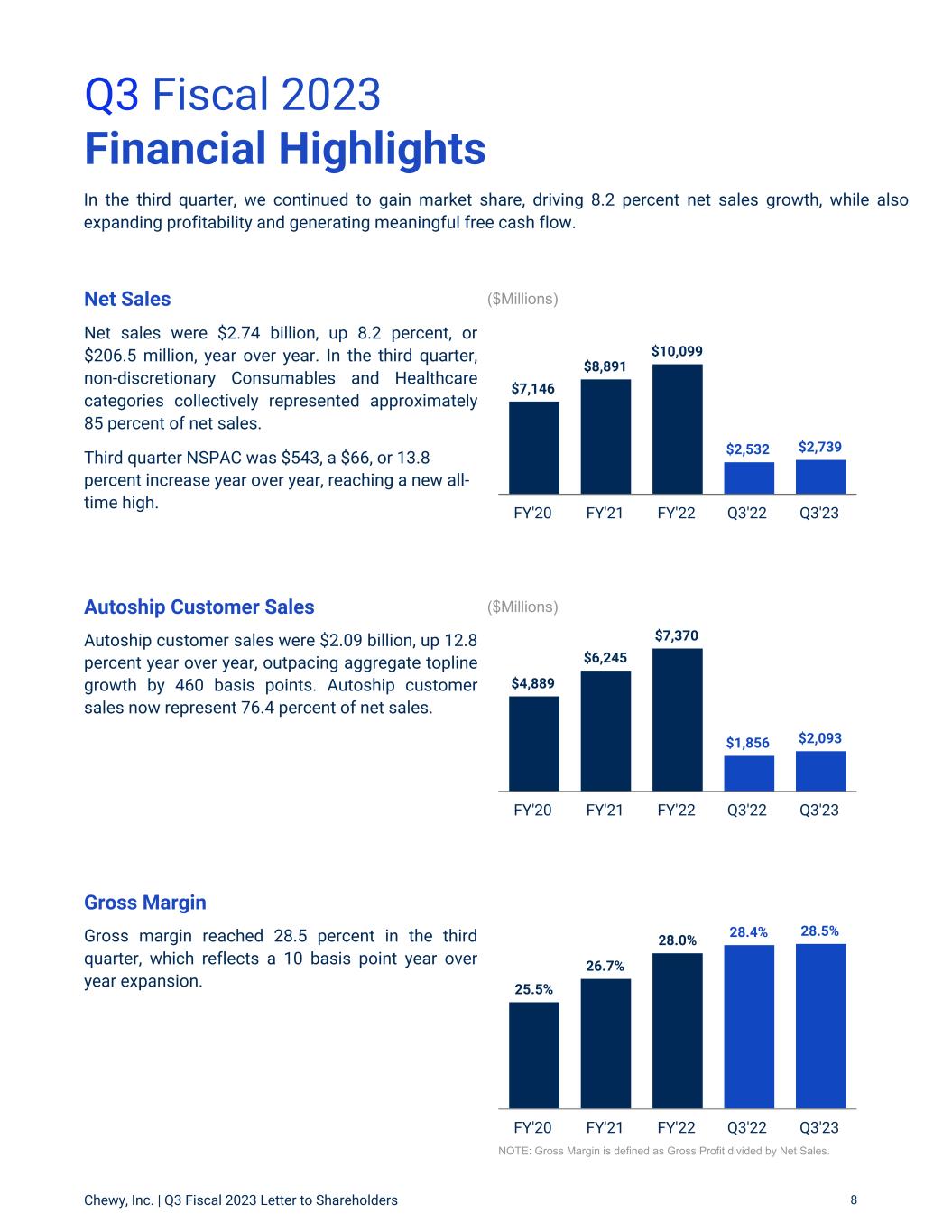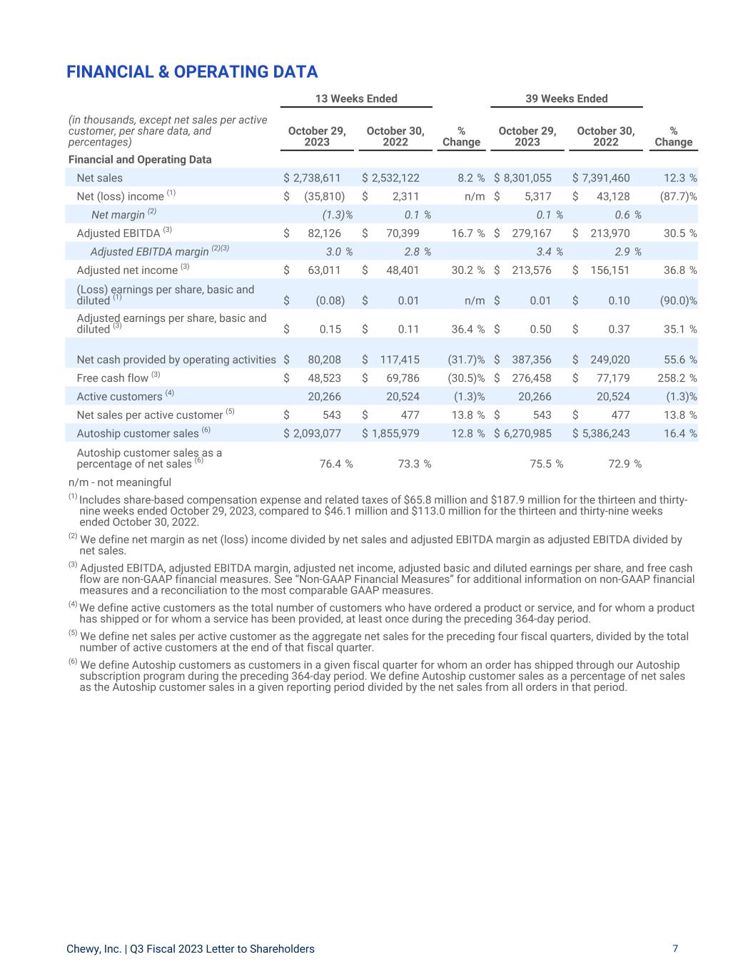 FINANCIAL & OPERATING DATA Chewy, Inc. | Q3 Fiscal 2023 Letter to Shareholders 7 13 Weeks Ended 39 Weeks Ended (in thousands, except net sales per active customer, per share data, and percentages) October 29, 2023 October 30, 2022 % Change October 29, 2023 October 30, 2022 % Change Financial and Operating Data Net sales $ 2,738,611 $ 2,532,122 8.2 % $ 8,301,055 $ 7,391,460 12.3 % Net (loss) income (1) $ (35,810) $ 2,311 n/m $ 5,317 $ 43,128 (87.7) % Net margin (2) (1.3) % 0.1 % 0.1 % 0.6 % Adjusted EBITDA (3) $ 82,126 $ 70,399 16.7 % $ 279,167 $ 213,970 30.5 % Adjusted EBITDA margin (2)(3) 3.0 % 2.8 % 3.4 % 2.9 % Adjusted net income (3) $ 63,011 $ 48,401 30.2 % $ 213,576 $ 156,151 36.8 % (Loss) earnings per share, basic and diluted (1) $ (0.08) $ 0.01 n/m $ 0.01 $ 0.10 (90.0) % Adjusted earnings per share, basic and diluted (3) $ 0.15 $ 0.11 36.4 % $ 0.50 $ 0.37 35.1 % Net cash provided by operating activities $ 80,208 $ 117,415 (31.7) % $ 387,356 $ 249,020 55.6 % Free cash flow (3) $ 48,523 $ 69,786 (30.5) % $ 276,458 $ 77,179 258.2 % Active customers (4) 20,266 20,524 (1.3) % 20,266 20,524 (1.3) % Net sales per active customer (5) $ 543 $ 477 13.8 % $ 543 $ 477 13.8 % Autoship customer sales (6) $ 2,093,077 $ 1,855,979 12.8 % $ 6,270,985 $ 5,386,243 16.4 % Autoship customer sales as a percentage of net sales (6) 76.4 % 73.3 % 75.5 % 72.9 % n/m - not meaningful (1) Includes share-based compensation expense and related taxes of $65.8 million and $187.9 million for the thirteen and thirty- nine weeks ended October 29, 2023, compared to $46.1 million and $113.0 million for the thirteen and thirty-nine weeks ended October 30, 2022. (2) We define net margin as net (loss) income divided by net sales and adjusted EBITDA margin as adjusted EBITDA divided by net sales. (3) Adjusted EBITDA, adjusted EBITDA margin, adjusted net income, adjusted basic and diluted earnings per share, and free cash flow are non-GAAP financial measures. See “Non-GAAP Financial Measures” for additional information on non-GAAP financial measures and a reconciliation to the most comparable GAAP measures. (4) We define active customers as the total number of customers who have ordered a product or service, and for whom a product has shipped or for whom a service has been provided, at least once during the preceding 364-day period. (5) We define net sales per active customer as the aggregate net sales for the preceding four fiscal quarters, divided by the total number of active customers at the end of that fiscal quarter. (6) We define Autoship customers as customers in a given fiscal quarter for whom an order has shipped through our Autoship subscription program during the preceding 364-day period. We define Autoship customer sales as a percentage of net sales as the Autoship customer sales in a given reporting period divided by the net sales from all orders in that period.