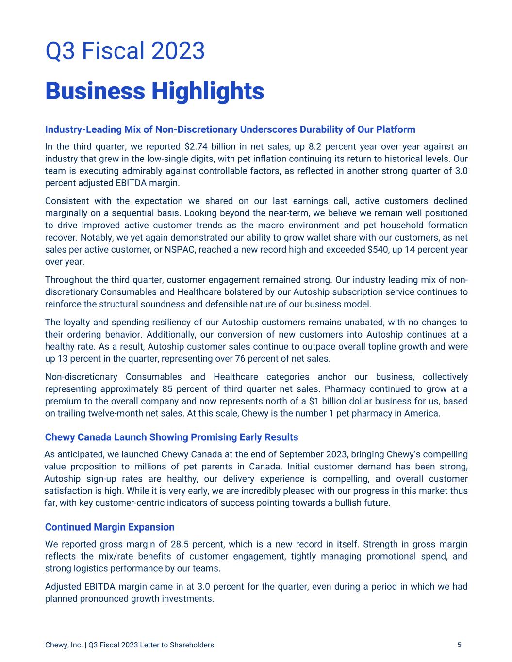 Chewy, Inc. | Q3 Fiscal 2023 Letter to Shareholders 5 Q3 Fiscal 2023 Business Highlights Industry-Leading Mix of Non-Discretionary Underscores Durability of Our Platform In the third quarter, we reported $2.74 billion in net sales, up 8.2 percent year over year against an industry that grew in the low-single digits, with pet inflation continuing its return to historical levels. Our team is executing admirably against controllable factors, as reflected in another strong quarter of 3.0 percent adjusted EBITDA margin. Consistent with the expectation we shared on our last earnings call, active customers declined marginally on a sequential basis. Looking beyond the near-term, we believe we remain well positioned to drive improved active customer trends as the macro environment and pet household formation recover. Notably, we yet again demonstrated our ability to grow wallet share with our customers, as net sales per active customer, or NSPAC, reached a new record high and exceeded $540, up 14 percent year over year. Throughout the third quarter, customer engagement remained strong. Our industry leading mix of non- discretionary Consumables and Healthcare bolstered by our Autoship subscription service continues to reinforce the structural soundness and defensible nature of our business model. The loyalty and spending resiliency of our Autoship customers remains unabated, with no changes to their ordering behavior. Additionally, our conversion of new customers into Autoship continues at a healthy rate. As a result, Autoship customer sales continue to outpace overall topline growth and were up 13 percent in the quarter, representing over 76 percent of net sales. Non-discretionary Consumables and Healthcare categories anchor our business, collectively representing approximately 85 percent of third quarter net sales. Pharmacy continued to grow at a premium to the overall company and now represents north of a $1 billion dollar business for us, based on trailing twelve-month net sales. At this scale, Chewy is the number 1 pet pharmacy in America. Chewy Canada Launch Showing Promising Early Results As anticipated, we launched Chewy Canada at the end of September 2023, bringing Chewy’s compelling value proposition to millions of pet parents in Canada. Initial customer demand has been strong, Autoship sign-up rates are healthy, our delivery experience is compelling, and overall customer satisfaction is high. While it is very early, we are incredibly pleased with our progress in this market thus far, with key customer-centric indicators of success pointing towards a bullish future. Continued Margin Expansion We reported gross margin of 28.5 percent, which is a new record in itself. Strength in gross margin reflects the mix/rate benefits of customer engagement, tightly managing promotional spend, and strong logistics performance by our teams. Adjusted EBITDA margin came in at 3.0 percent for the quarter, even during a period in which we had planned pronounced growth investments.