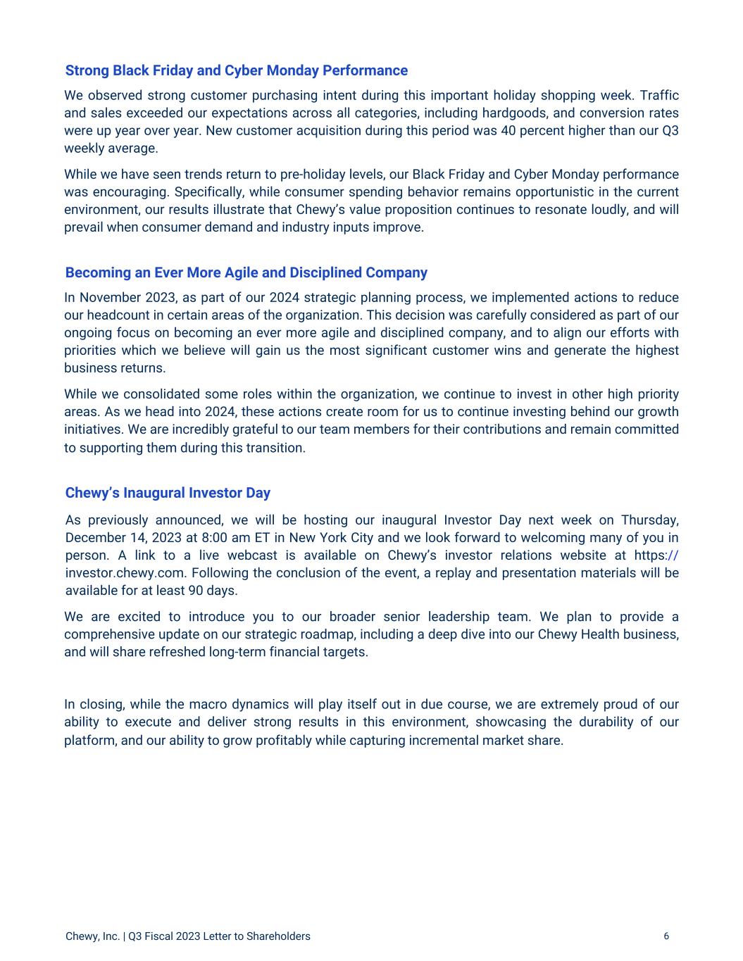 Strong Black Friday and Cyber Monday Performance We observed strong customer purchasing intent during this important holiday shopping week. Traffic and sales exceeded our expectations across all categories, including hardgoods, and conversion rates were up year over year. New customer acquisition during this period was 40 percent higher than our Q3 weekly average. While we have seen trends return to pre-holiday levels, our Black Friday and Cyber Monday performance was encouraging. Specifically, while consumer spending behavior remains opportunistic in the current environment, our results illustrate that Chewy’s value proposition continues to resonate loudly, and will prevail when consumer demand and industry inputs improve. Becoming an Ever More Agile and Disciplined Company In November 2023, as part of our 2024 strategic planning process, we implemented actions to reduce our headcount in certain areas of the organization. This decision was carefully considered as part of our ongoing focus on becoming an ever more agile and disciplined company, and to align our efforts with priorities which we believe will gain us the most significant customer wins and generate the highest business returns. While we consolidated some roles within the organization, we continue to invest in other high priority areas. As we head into 2024, these actions create room for us to continue investing behind our growth initiatives. We are incredibly grateful to our team members for their contributions and remain committed to supporting them during this transition. Chewy’s Inaugural Investor Day As previously announced, we will be hosting our inaugural Investor Day next week on Thursday, December 14, 2023 at 8:00 am ET in New York City and we look forward to welcoming many of you in person. A link to a live webcast is available on Chewy’s investor relations website at https:// investor.chewy.com. Following the conclusion of the event, a replay and presentation materials will be available for at least 90 days. We are excited to introduce you to our broader senior leadership team. We plan to provide a comprehensive update on our strategic roadmap, including a deep dive into our Chewy Health business, and will share refreshed long-term financial targets. In closing, while the macro dynamics will play itself out in due course, we are extremely proud of our ability to execute and deliver strong results in this environment, showcasing the durability of our platform, and our ability to grow profitably while capturing incremental market share. Chewy, Inc. | Q3 Fiscal 2023 Letter to Shareholders 6