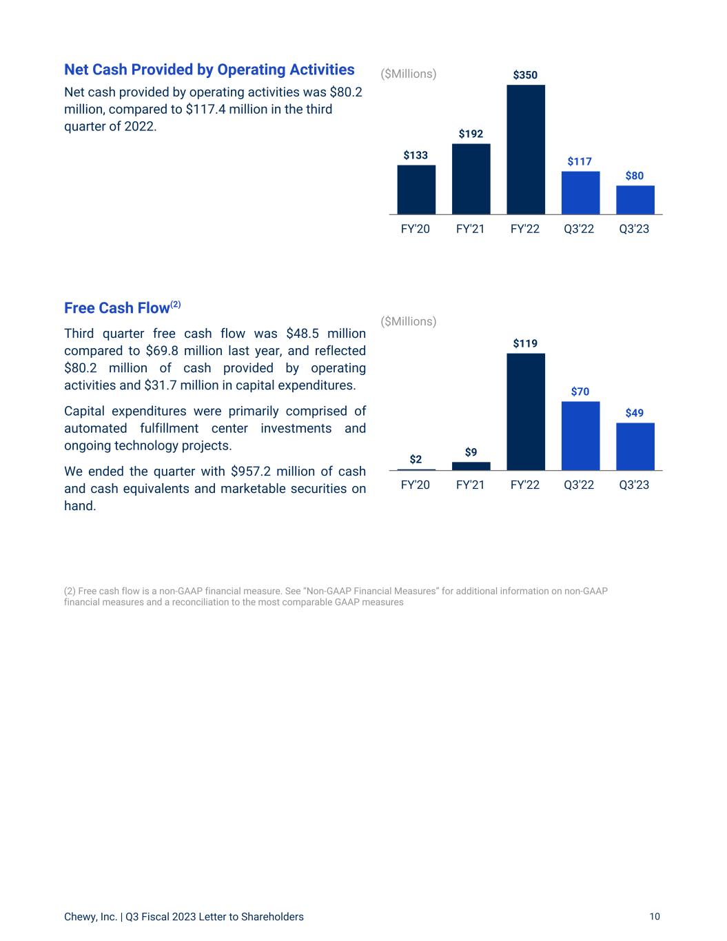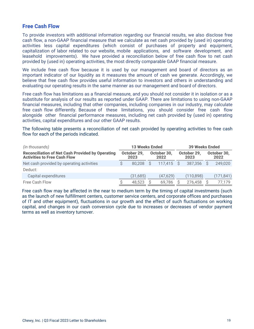 Chewy, Inc. | Q3 Fiscal 2023 Letter to Shareholders 19 Free cash flow may be affected in the near to medium term by the timing of capital investments (such as the launch of new fulfillment centers, customer service centers, and corporate offices and purchases of IT and other equipment), fluctuations in our growth and the effect of such fluctuations on working capital, and changes in our cash conversion cycle due to increases or decreases of vendor payment terms as well as inventory turnover. Free Cash Flow To provide investors with additional information regarding our financial results, we also disclose free cash flow, a non-GAAP financial measure that we calculate as net cash provided by (used in) operating activities less capital expenditures (which consist of purchases of property and equipment, capitalization of labor related to our website, mobile applications, and software development, and leasehold improvements). We have provided a reconciliation below of free cash flow to net cash provided by (used in) operating activities, the most directly comparable GAAP financial measure. We include free cash flow because it is used by our management and board of directors as an important indicator of our liquidity as it measures the amount of cash we generate. Accordingly, we believe that free cash flow provides useful information to investors and others in understanding and evaluating our operating results in the same manner as our management and board of directors. Free cash flow has limitations as a financial measure, and you should not consider it in isolation or as a substitute for analysis of our results as reported under GAAP. There are limitations to using non-GAAP financial measures, including that other companies, including companies in our industry, may calculate free cash flow differently. Because of these limitations, you should consider free cash flow alongside other financial performance measures, including net cash provided by (used in) operating activities, capital expenditures and our other GAAP results. The following table presents a reconciliation of net cash provided by operating activities to free cash flow for each of the periods indicated. (in thousands) 13 Weeks Ended 39 Weeks Ended Reconciliation of Net Cash Provided by Operating Activities to Free Cash Flow October 29, 2023 October 30, 2022 October 29, 2023 October 30, 2022 Net cash provided by operating activities $ 80,208 $ 117,415 $ 387,356 $ 249,020 Deduct: Capital expenditures (31,685) (47,629) (110,898) (171,841) Free Cash Flow $ 48,523 $ 69,786 $ 276,458 $ 77,179
