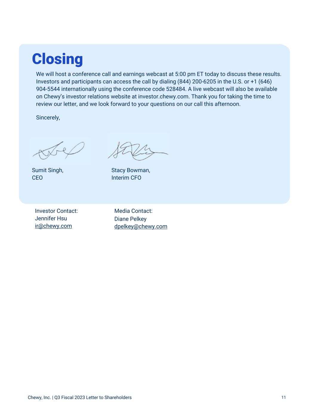 Media Contact: Diane Pelkey dpelkey@chewy.com Investor Contact: Jennifer Hsu ir@chewy.com We will host a conference call and earnings webcast at 5:00 pm ET today to discuss these results. Investors and participants can access the call by dialing (844) 200-6205 in the U.S. or +1 (646) 904-5544 internationally using the conference code 528484. A live webcast will also be available on Chewy’s investor relations website at investor.chewy.com. Thank you for taking the time to review our letter, and we look forward to your questions on our call this afternoon. Sincerely, Closing Stacy Bowman, Interim CFO Sumit Singh, CEO Chewy, Inc. | Q3 Fiscal 2023 Letter to Shareholders 11