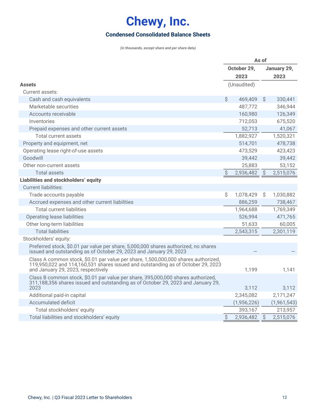 Chewy, Inc. Condensed Consolidated Balance Sheets (in thousands, except share and per share data) Chewy, Inc. | Q3 Fiscal 2023 Letter to Shareholders 12 As of October 29, January 29, 2023 2023 Assets (Unaudited) Current assets: Cash and cash equivalents $ 469,409 $ 330,441 Marketable securities 487,772 346,944 Accounts receivable 160,980 126,349 Inventories 712,053 675,520 Prepaid expenses and other current assets 52,713 41,067 Total current assets 1,882,927 1,520,321 Property and equipment, net 514,701 478,738 Operating lease right-of-use assets 473,529 423,423 Goodwill 39,442 39,442 Other non-current assets 25,883 53,152 Total assets $ 2,936,482 $ 2,515,076 Liabilities and stockholders’ equity Current liabilities: Trade accounts payable $ 1,078,429 $ 1,030,882 Accrued expenses and other current liabilities 886,259 738,467 Total current liabilities 1,964,688 1,769,349 Operating lease liabilities 526,994 471,765 Other long-term liabilities 51,633 60,005 Total liabilities 2,543,315 2,301,119 Stockholders’ equity: Preferred stock, $0.01 par value per share, 5,000,000 shares authorized, no shares issued and outstanding as of October 29, 2023 and January 29, 2023 — — Class A common stock, $0.01 par value per share, 1,500,000,000 shares authorized, 119,950,022 and 114,160,531 shares issued and outstanding as of October 29, 2023 and January 29, 2023, respectively 1,199 1,141 Class B common stock, $0.01 par value per share, 395,000,000 shares authorized, 311,188,356 shares issued and outstanding as of October 29, 2023 and January 29, 2023 3,112 3,112 Additional paid-in capital 2,345,082 2,171,247 Accumulated deficit (1,956,226) (1,961,543) Total stockholders’ equity 393,167 213,957 Total liabilities and stockholders’ equity $ 2,936,482 $ 2,515,076