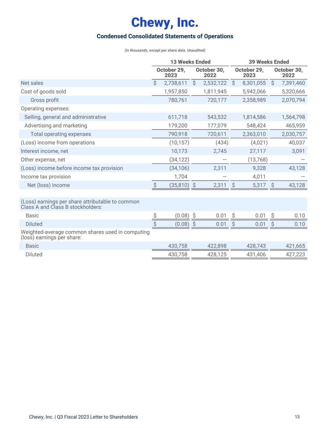 Chewy, Inc. Condensed Consolidated Statements of Operations (in thousands, except per share data. Unaudited) Chewy, Inc. | Q3 Fiscal 2023 Letter to Shareholders 13 13 Weeks Ended 39 Weeks Ended October 29, 2023 October 30, 2022 October 29, 2023 October 30, 2022 Net sales $ 2,738,611 $ 2,532,122 $ 8,301,055 $ 7,391,460 Cost of goods sold 1,957,850 1,811,945 5,942,066 5,320,666 Gross profit 780,761 720,177 2,358,989 2,070,794 Operating expenses: Selling, general and administrative 611,718 543,532 1,814,586 1,564,798 Advertising and marketing 179,200 177,079 548,424 465,959 Total operating expenses 790,918 720,611 2,363,010 2,030,757 (Loss) income from operations (10,157) (434) (4,021) 40,037 Interest income, net 10,173 2,745 27,117 3,091 Other expense, net (34,122) — (13,768) — (Loss) income before income tax provision (34,106) 2,311 9,328 43,128 Income tax provision 1,704 — 4,011 — Net (loss) income $ (35,810) $ 2,311 $ 5,317 $ 43,128 (Loss) earnings per share attributable to common Class A and Class B stockholders: Basic $ (0.08) $ 0.01 $ 0.01 $ 0.10 Diluted $ (0.08) $ 0.01 $ 0.01 $ 0.10 Weighted-average common shares used in computing (loss) earnings per share: Basic 430,758 422,898 428,743 421,665 Diluted 430,758 428,125 431,406 427,223