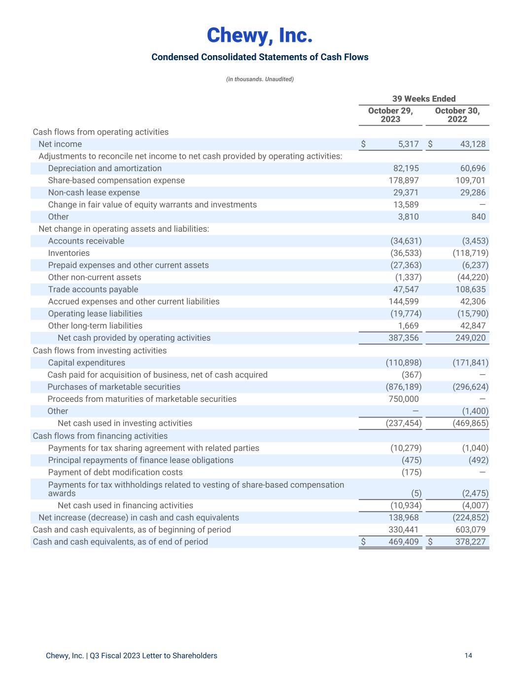 Chewy, Inc. Condensed Consolidated Statements of Cash Flows (in thousands. Unaudited) Chewy, Inc. | Q3 Fiscal 2023 Letter to Shareholders 14 39 Weeks Ended October 29, 2023 October 30, 2022 Cash flows from operating activities Net income $ 5,317 $ 43,128 Adjustments to reconcile net income to net cash provided by operating activities: Depreciation and amortization 82,195 60,696 Share-based compensation expense 178,897 109,701 Non-cash lease expense 29,371 29,286 Change in fair value of equity warrants and investments 13,589 — Other 3,810 840 Net change in operating assets and liabilities: Accounts receivable (34,631) (3,453) Inventories (36,533) (118,719) Prepaid expenses and other current assets (27,363) (6,237) Other non-current assets (1,337) (44,220) Trade accounts payable 47,547 108,635 Accrued expenses and other current liabilities 144,599 42,306 Operating lease liabilities (19,774) (15,790) Other long-term liabilities 1,669 42,847 Net cash provided by operating activities 387,356 249,020 Cash flows from investing activities Capital expenditures (110,898) (171,841) Cash paid for acquisition of business, net of cash acquired (367) — Purchases of marketable securities (876,189) (296,624) Proceeds from maturities of marketable securities 750,000 — Other — (1,400) Net cash used in investing activities (237,454) (469,865) Cash flows from financing activities Payments for tax sharing agreement with related parties (10,279) (1,040) Principal repayments of finance lease obligations (475) (492) Payment of debt modification costs (175) — Payments for tax withholdings related to vesting of share-based compensation awards (5) (2,475) Net cash used in financing activities (10,934) (4,007) Net increase (decrease) in cash and cash equivalents 138,968 (224,852) Cash and cash equivalents, as of beginning of period 330,441 603,079 Cash and cash equivalents, as of end of period $ 469,409 $ 378,227