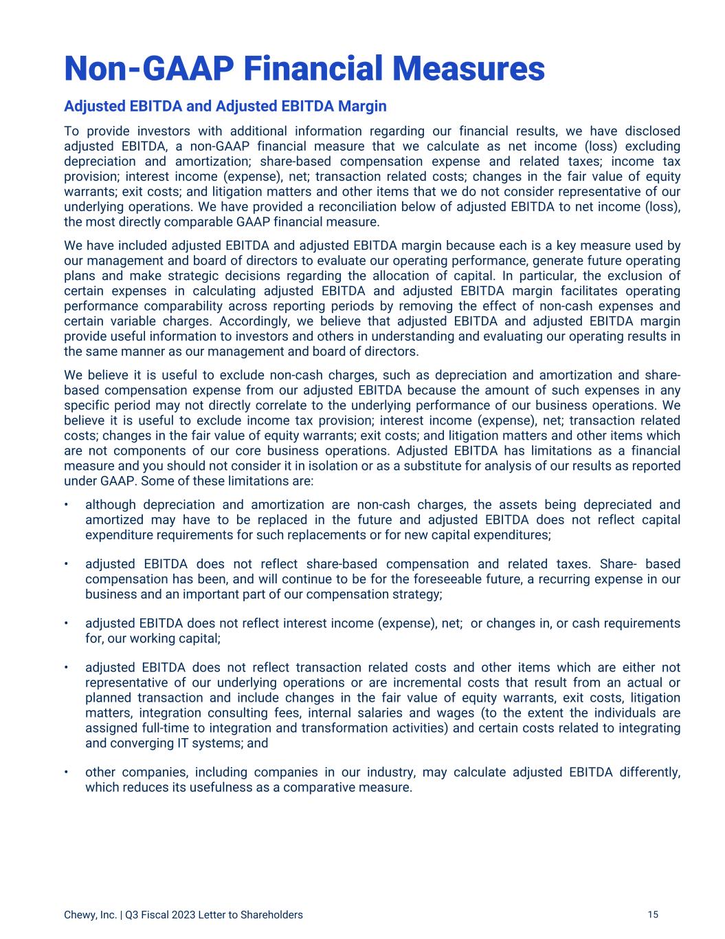 Non-GAAP Financial Measures Chewy, Inc. | Q3 Fiscal 2023 Letter to Shareholders 15 Adjusted EBITDA and Adjusted EBITDA Margin To provide investors with additional information regarding our financial results, we have disclosed adjusted EBITDA, a non-GAAP financial measure that we calculate as net income (loss) excluding depreciation and amortization; share-based compensation expense and related taxes; income tax provision; interest income (expense), net; transaction related costs; changes in the fair value of equity warrants; exit costs; and litigation matters and other items that we do not consider representative of our underlying operations. We have provided a reconciliation below of adjusted EBITDA to net income (loss), the most directly comparable GAAP financial measure. We have included adjusted EBITDA and adjusted EBITDA margin because each is a key measure used by our management and board of directors to evaluate our operating performance, generate future operating plans and make strategic decisions regarding the allocation of capital. In particular, the exclusion of certain expenses in calculating adjusted EBITDA and adjusted EBITDA margin facilitates operating performance comparability across reporting periods by removing the effect of non-cash expenses and certain variable charges. Accordingly, we believe that adjusted EBITDA and adjusted EBITDA margin provide useful information to investors and others in understanding and evaluating our operating results in the same manner as our management and board of directors. We believe it is useful to exclude non-cash charges, such as depreciation and amortization and share- based compensation expense from our adjusted EBITDA because the amount of such expenses in any specific period may not directly correlate to the underlying performance of our business operations. We believe it is useful to exclude income tax provision; interest income (expense), net; transaction related costs; changes in the fair value of equity warrants; exit costs; and litigation matters and other items which are not components of our core business operations. Adjusted EBITDA has limitations as a financial measure and you should not consider it in isolation or as a substitute for analysis of our results as reported under GAAP. Some of these limitations are: • although depreciation and amortization are non-cash charges, the assets being depreciated and amortized may have to be replaced in the future and adjusted EBITDA does not reflect capital expenditure requirements for such replacements or for new capital expenditures; • adjusted EBITDA does not reflect share-based compensation and related taxes. Share- based compensation has been, and will continue to be for the foreseeable future, a recurring expense in our business and an important part of our compensation strategy; • adjusted EBITDA does not reflect interest income (expense), net; or changes in, or cash requirements for, our working capital; • adjusted EBITDA does not reflect transaction related costs and other items which are either not representative of our underlying operations or are incremental costs that result from an actual or planned transaction and include changes in the fair value of equity warrants, exit costs, litigation matters, integration consulting fees, internal salaries and wages (to the extent the individuals are assigned full-time to integration and transformation activities) and certain costs related to integrating and converging IT systems; and • other companies, including companies in our industry, may calculate adjusted EBITDA differently, which reduces its usefulness as a comparative measure.