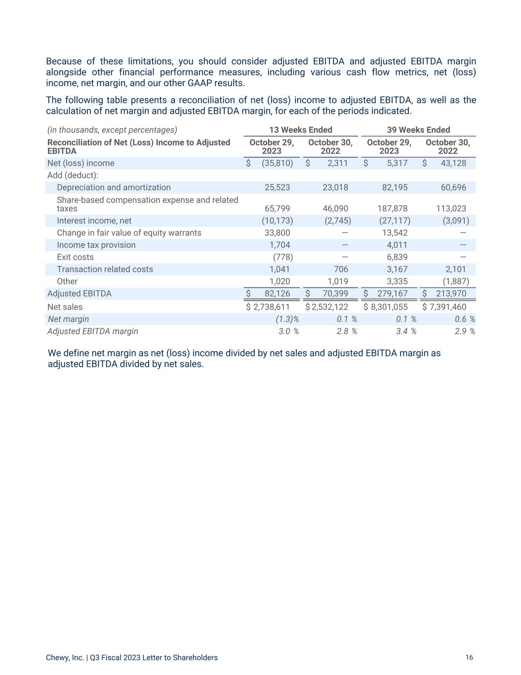 Because of these limitations, you should consider adjusted EBITDA and adjusted EBITDA margin alongside other financial performance measures, including various cash flow metrics, net (loss) income, net margin, and our other GAAP results. The following table presents a reconciliation of net (loss) income to adjusted EBITDA, as well as the calculation of net margin and adjusted EBITDA margin, for each of the periods indicated. Chewy, Inc. | Q3 Fiscal 2023 Letter to Shareholders 16 We define net margin as net (loss) income divided by net sales and adjusted EBITDA margin as adjusted EBITDA divided by net sales. (in thousands, except percentages) 13 Weeks Ended 39 Weeks Ended Reconciliation of Net (Loss) Income to Adjusted EBITDA October 29, 2023 October 30, 2022 October 29, 2023 October 30, 2022 Net (loss) income $ (35,810) $ 2,311 $ 5,317 $ 43,128 Add (deduct): Depreciation and amortization 25,523 23,018 82,195 60,696 Share-based compensation expense and related taxes 65,799 46,090 187,878 113,023 Interest income, net (10,173) (2,745) (27,117) (3,091) Change in fair value of equity warrants 33,800 — 13,542 — Income tax provision 1,704 — 4,011 — Exit costs (778) — 6,839 — Transaction related costs 1,041 706 3,167 2,101 Other 1,020 1,019 3,335 (1,887) Adjusted EBITDA $ 82,126 $ 70,399 $ 279,167 $ 213,970 Net sales $ 2,738,611 $ 2,532,122 $ 8,301,055 $ 7,391,460 Net margin (1.3) % 0.1 % 0.1 % 0.6 % Adjusted EBITDA margin 3.0 % 2.8 % 3.4 % 2.9 %
