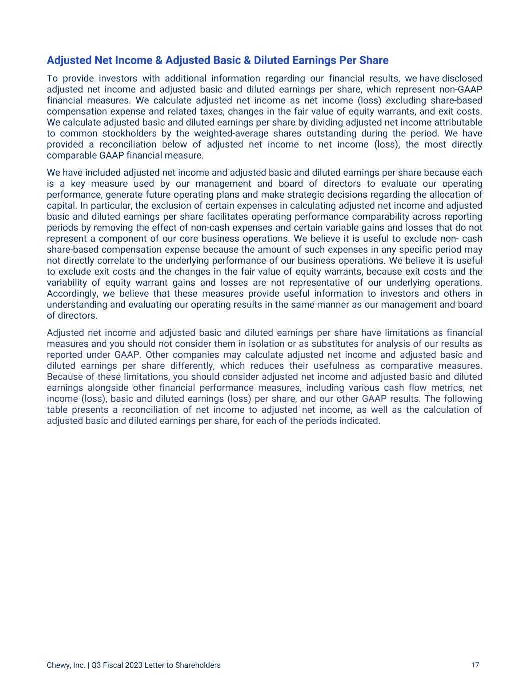 Adjusted Net Income & Adjusted Basic & Diluted Earnings Per Share To provide investors with additional information regarding our financial results, we have disclosed adjusted net income and adjusted basic and diluted earnings per share, which represent non-GAAP financial measures. We calculate adjusted net income as net income (loss) excluding share-based compensation expense and related taxes, changes in the fair value of equity warrants, and exit costs. We calculate adjusted basic and diluted earnings per share by dividing adjusted net income attributable to common stockholders by the weighted-average shares outstanding during the period. We have provided a reconciliation below of adjusted net income to net income (loss), the most directly comparable GAAP financial measure. We have included adjusted net income and adjusted basic and diluted earnings per share because each is a key measure used by our management and board of directors to evaluate our operating performance, generate future operating plans and make strategic decisions regarding the allocation of capital. In particular, the exclusion of certain expenses in calculating adjusted net income and adjusted basic and diluted earnings per share facilitates operating performance comparability across reporting periods by removing the effect of non-cash expenses and certain variable gains and losses that do not represent a component of our core business operations. We believe it is useful to exclude non- cash share-based compensation expense because the amount of such expenses in any specific period may not directly correlate to the underlying performance of our business operations. We believe it is useful to exclude exit costs and the changes in the fair value of equity warrants, because exit costs and the variability of equity warrant gains and losses are not representative of our underlying operations. Accordingly, we believe that these measures provide useful information to investors and others in understanding and evaluating our operating results in the same manner as our management and board of directors. Adjusted net income and adjusted basic and diluted earnings per share have limitations as financial measures and you should not consider them in isolation or as substitutes for analysis of our results as reported under GAAP. Other companies may calculate adjusted net income and adjusted basic and diluted earnings per share differently, which reduces their usefulness as comparative measures. Because of these limitations, you should consider adjusted net income and adjusted basic and diluted earnings alongside other financial performance measures, including various cash flow metrics, net income (loss), basic and diluted earnings (loss) per share, and our other GAAP results. The following table presents a reconciliation of net income to adjusted net income, as well as the calculation of adjusted basic and diluted earnings per share, for each of the periods indicated. Chewy, Inc. | Q3 Fiscal 2023 Letter to Shareholders 17