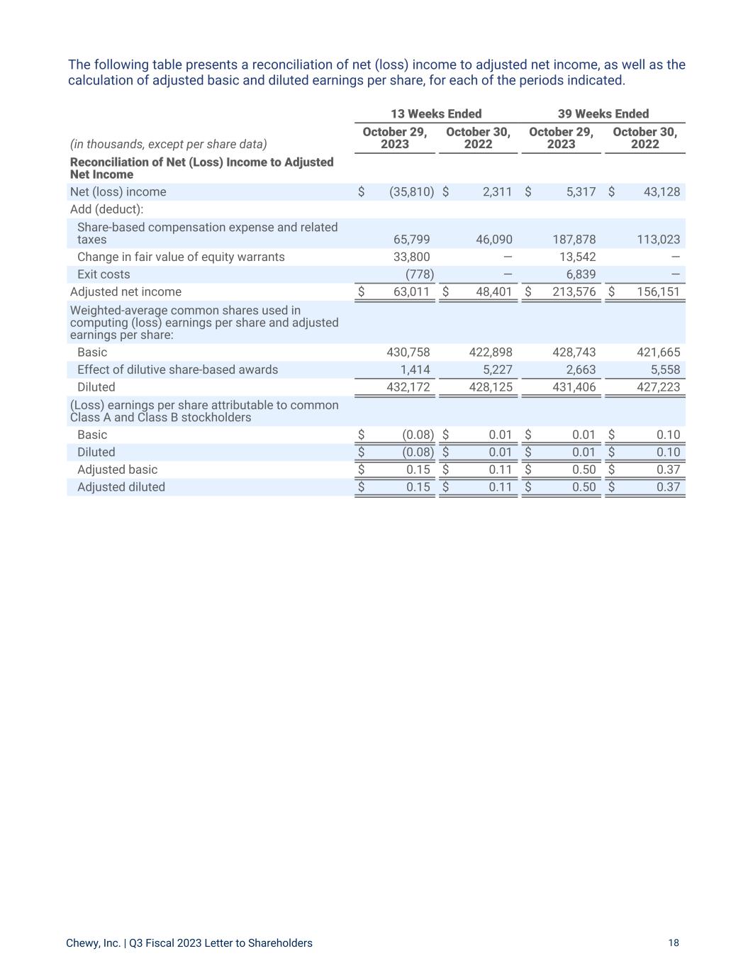 The following table presents a reconciliation of net (loss) income to adjusted net income, as well as the calculation of adjusted basic and diluted earnings per share, for each of the periods indicated. Chewy, Inc. | Q3 Fiscal 2023 Letter to Shareholders 18 13 Weeks Ended 39 Weeks Ended (in thousands, except per share data) October 29, 2023 October 30, 2022 October 29, 2023 October 30, 2022 Reconciliation of Net (Loss) Income to Adjusted Net Income Net (loss) income $ (35,810) $ 2,311 $ 5,317 $ 43,128 Add (deduct): Share-based compensation expense and related taxes 65,799 46,090 187,878 113,023 Change in fair value of equity warrants 33,800 — 13,542 — Exit costs (778) — 6,839 — Adjusted net income $ 63,011 $ 48,401 $ 213,576 $ 156,151 Weighted-average common shares used in computing (loss) earnings per share and adjusted earnings per share: Basic 430,758 422,898 428,743 421,665 Effect of dilutive share-based awards 1,414 5,227 2,663 5,558 Diluted 432,172 428,125 431,406 427,223 (Loss) earnings per share attributable to common Class A and Class B stockholders Basic $ (0.08) $ 0.01 $ 0.01 $ 0.10 Diluted $ (0.08) $ 0.01 $ 0.01 $ 0.10 Adjusted basic $ 0.15 $ 0.11 $ 0.50 $ 0.37 Adjusted diluted $ 0.15 $ 0.11 $ 0.50 $ 0.37