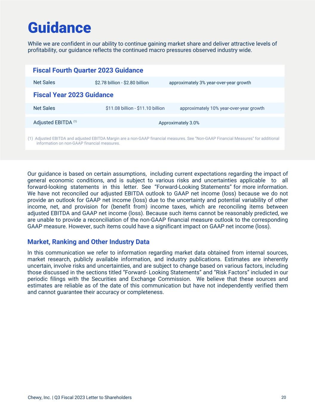 Chewy, Inc. | Q3 Fiscal 2023 Letter to Shareholders 20 Guidance Fiscal Fourth Quarter 2023 Guidance Fiscal Year 2023 Guidance Adjusted EBITDA (1) (1) Adjusted EBITDA and adjusted EBITDA Margin are a non-GAAP financial measures. See “Non-GAAP Financial Measures” for additional information on non-GAAP financial measures. Approximately 3.0% Net Sales $2.78 billion - $2.80 billion approximately 3% year-over-year growth Net Sales $11.08 billion - $11.10 billion approximately 10% year-over-year growth Our guidance is based on certain assumptions, including current expectations regarding the impact of general economic conditions, and is subject to various risks and uncertainties applicable to all forward-looking statements in this letter. See “Forward-Looking Statements” for more information. We have not reconciled our adjusted EBITDA outlook to GAAP net income (loss) because we do not provide an outlook for GAAP net income (loss) due to the uncertainty and potential variability of other income, net, and provision for (benefit from) income taxes, which are reconciling items between adjusted EBITDA and GAAP net income (loss). Because such items cannot be reasonably predicted, we are unable to provide a reconciliation of the non-GAAP financial measure outlook to the corresponding GAAP measure. However, such items could have a significant impact on GAAP net income (loss). Market, Ranking and Other Industry Data In this communication we refer to information regarding market data obtained from internal sources, market research, publicly available information, and industry publications. Estimates are inherently uncertain, involve risks and uncertainties, and are subject to change based on various factors, including those discussed in the sections titled “Forward- Looking Statements” and “Risk Factors” included in our periodic filings with the Securities and Exchange Commission. We believe that these sources and estimates are reliable as of the date of this communication but have not independently verified them and cannot guarantee their accuracy or completeness. While we are confident in our ability to continue gaining market share and deliver attractive levels of profitability, our guidance reflects the continued macro pressures observed industry wide.
