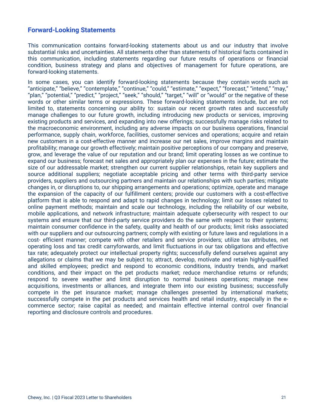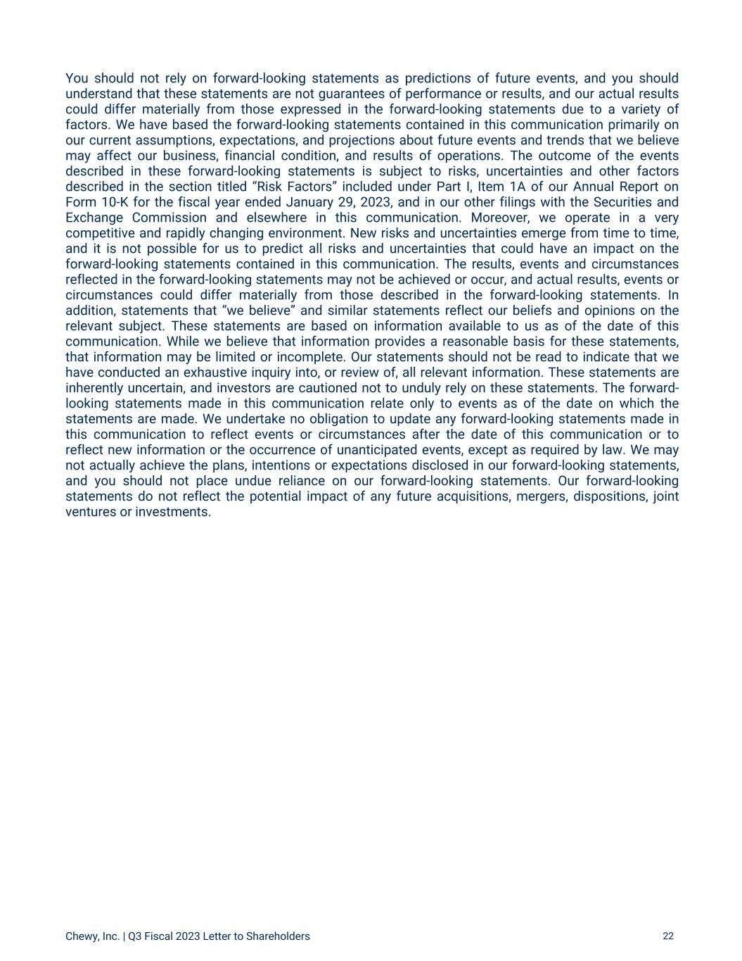 Chewy, Inc. | Q3 Fiscal 2023 Letter to Shareholders 22 You should not rely on forward-looking statements as predictions of future events, and you should understand that these statements are not guarantees of performance or results, and our actual results could differ materially from those expressed in the forward-looking statements due to a variety of factors. We have based the forward-looking statements contained in this communication primarily on our current assumptions, expectations, and projections about future events and trends that we believe may affect our business, financial condition, and results of operations. The outcome of the events described in these forward-looking statements is subject to risks, uncertainties and other factors described in the section titled “Risk Factors” included under Part I, Item 1A of our Annual Report on Form 10-K for the fiscal year ended January 29, 2023, and in our other filings with the Securities and Exchange Commission and elsewhere in this communication. Moreover, we operate in a very competitive and rapidly changing environment. New risks and uncertainties emerge from time to time, and it is not possible for us to predict all risks and uncertainties that could have an impact on the forward-looking statements contained in this communication. The results, events and circumstances reflected in the forward-looking statements may not be achieved or occur, and actual results, events or circumstances could differ materially from those described in the forward-looking statements. In addition, statements that “we believe” and similar statements reflect our beliefs and opinions on the relevant subject. These statements are based on information available to us as of the date of this communication. While we believe that information provides a reasonable basis for these statements, that information may be limited or incomplete. Our statements should not be read to indicate that we have conducted an exhaustive inquiry into, or review of, all relevant information. These statements are inherently uncertain, and investors are cautioned not to unduly rely on these statements. The forward- looking statements made in this communication relate only to events as of the date on which the statements are made. We undertake no obligation to update any forward-looking statements made in this communication to reflect events or circumstances after the date of this communication or to reflect new information or the occurrence of unanticipated events, except as required by law. We may not actually achieve the plans, intentions or expectations disclosed in our forward-looking statements, and you should not place undue reliance on our forward-looking statements. Our forward-looking statements do not reflect the potential impact of any future acquisitions, mergers, dispositions, joint ventures or investments.