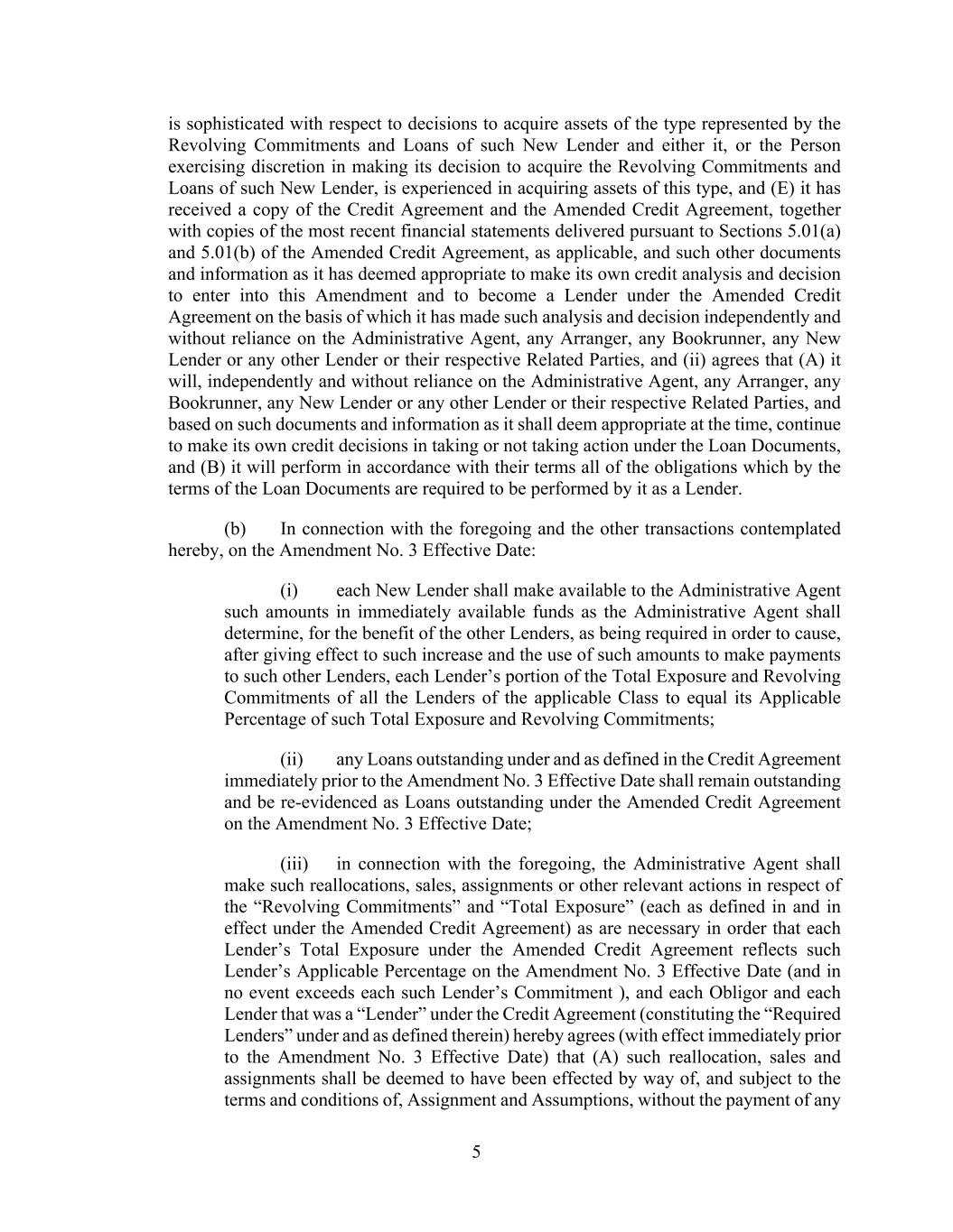 5 is sophisticated with respect to decisions to acquire assets of the type represented by the Revolving Commitments and Loans of such New Lender and either it, or the Person exercising discretion in making its decision to acquire the Revolving Commitments and Loans of such New Lender, is experienced in acquiring assets of this type, and (E) it has received a copy of the Credit Agreement and the Amended Credit Agreement, together with copies of the most recent financial statements delivered pursuant to Sections 5.01(a) and 5.01(b) of the Amended Credit Agreement, as applicable, and such other documents and information as it has deemed appropriate to make its own credit analysis and decision to enter into this Amendment and to become a Lender under the Amended Credit Agreement on the basis of which it has made such analysis and decision independently and without reliance on the Administrative Agent, any Arranger, any Bookrunner, any New Lender or any other Lender or their respective Related Parties, and (ii) agrees that (A) it will, independently and without reliance on the Administrative Agent, any Arranger, any Bookrunner, any New Lender or any other Lender or their respective Related Parties, and based on such documents and information as it shall deem appropriate at the time, continue to make its own credit decisions in taking or not taking action under the Loan Documents, and (B) it will perform in accordance with their terms all of the obligations which by the terms of the Loan Documents are required to be performed by it as a Lender. (b) In connection with the foregoing and the other transactions contemplated hereby, on the Amendment No. 3 Effective Date: (i) each New Lender shall make available to the Administrative Agent such amounts in immediately available funds as the Administrative Agent shall determine, for the benefit of the other Lenders, as being required in order to cause, after giving effect to such increase and the use of such amounts to make payments to such other Lenders, each Lender’s portion of the Total Exposure and Revolving Commitments of all the Lenders of the applicable Class to equal its Applicable Percentage of such Total Exposure and Revolving Commitments; (ii) any Loans outstanding under and as defined in the Credit Agreement immediately prior to the Amendment No. 3 Effective Date shall remain outstanding and be re-evidenced as Loans outstanding under the Amended Credit Agreement on the Amendment No. 3 Effective Date; (iii) in connection with the foregoing, the Administrative Agent shall make such reallocations, sales, assignments or other relevant actions in respect of the “Revolving Commitments” and “Total Exposure” (each as defined in and in effect under the Amended Credit Agreement) as are necessary in order that each Lender’s Total Exposure under the Amended Credit Agreement reflects such Lender’s Applicable Percentage on the Amendment No. 3 Effective Date (and in no event exceeds each such Lender’s Commitment ), and each Obligor and each Lender that was a “Lender” under the Credit Agreement (constituting the “Required Lenders” under and as defined therein) hereby agrees (with effect immediately prior to the Amendment No. 3 Effective Date) that (A) such reallocation, sales and assignments shall be deemed to have been effected by way of, and subject to the terms and conditions of, Assignment and Assumptions, without the payment of any