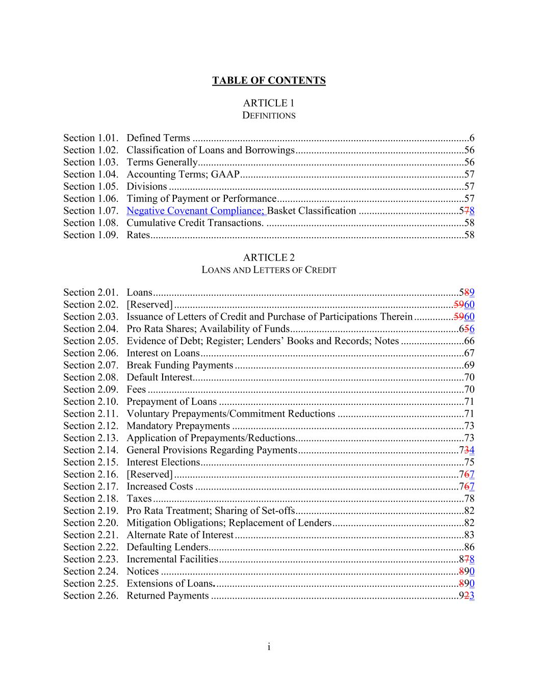 i TABLE OF CONTENTS ARTICLE 1 DEFINITIONS Section 1.01. Defined Terms .........................................................................................................6 Section 1.02. Classification of Loans and Borrowings................................................................56 Section 1.03. Terms Generally.....................................................................................................56 Section 1.04. Accounting Terms; GAAP.....................................................................................57 Section 1.05. Divisions ................................................................................................................57 Section 1.06. Timing of Payment or Performance.......................................................................57 Section 1.07. Negative Covenant Compliance; Basket Classification ......................................578 Section 1.08. Cumulative Credit Transactions. ...........................................................................58 Section 1.09. Rates.......................................................................................................................58 ARTICLE 2 LOANS AND LETTERS OF CREDIT Section 2.01. Loans....................................................................................................................589 Section 2.02. [Reserved] ..........................................................................................................5960 Section 2.03. Issuance of Letters of Credit and Purchase of Participations Therein ...............5960 Section 2.04. Pro Rata Shares; Availability of Funds................................................................656 Section 2.05. Evidence of Debt; Register; Lenders’ Books and Records; Notes ........................66 Section 2.06. Interest on Loans....................................................................................................67 Section 2.07. Break Funding Payments .......................................................................................69 Section 2.08. Default Interest.......................................................................................................70 Section 2.09. Fees ........................................................................................................................70 Section 2.10. Prepayment of Loans .............................................................................................71 Section 2.11. Voluntary Prepayments/Commitment Reductions ................................................71 Section 2.12. Mandatory Prepayments ........................................................................................73 Section 2.13. Application of Prepayments/Reductions................................................................73 Section 2.14. General Provisions Regarding Payments.............................................................734 Section 2.15. Interest Elections....................................................................................................75 Section 2.16. [Reserved] ............................................................................................................767 Section 2.17. Increased Costs ....................................................................................................767 Section 2.18. Taxes ......................................................................................................................78 Section 2.19. Pro Rata Treatment; Sharing of Set-offs................................................................82 Section 2.20. Mitigation Obligations; Replacement of Lenders..................................................82 Section 2.21. Alternate Rate of Interest .......................................................................................83 Section 2.22. Defaulting Lenders.................................................................................................86 Section 2.23. Incremental Facilities...........................................................................................878 Section 2.24. Notices .................................................................................................................890 Section 2.25. Extensions of Loans. ............................................................................................890 Section 2.26. Returned Payments ..............................................................................................923