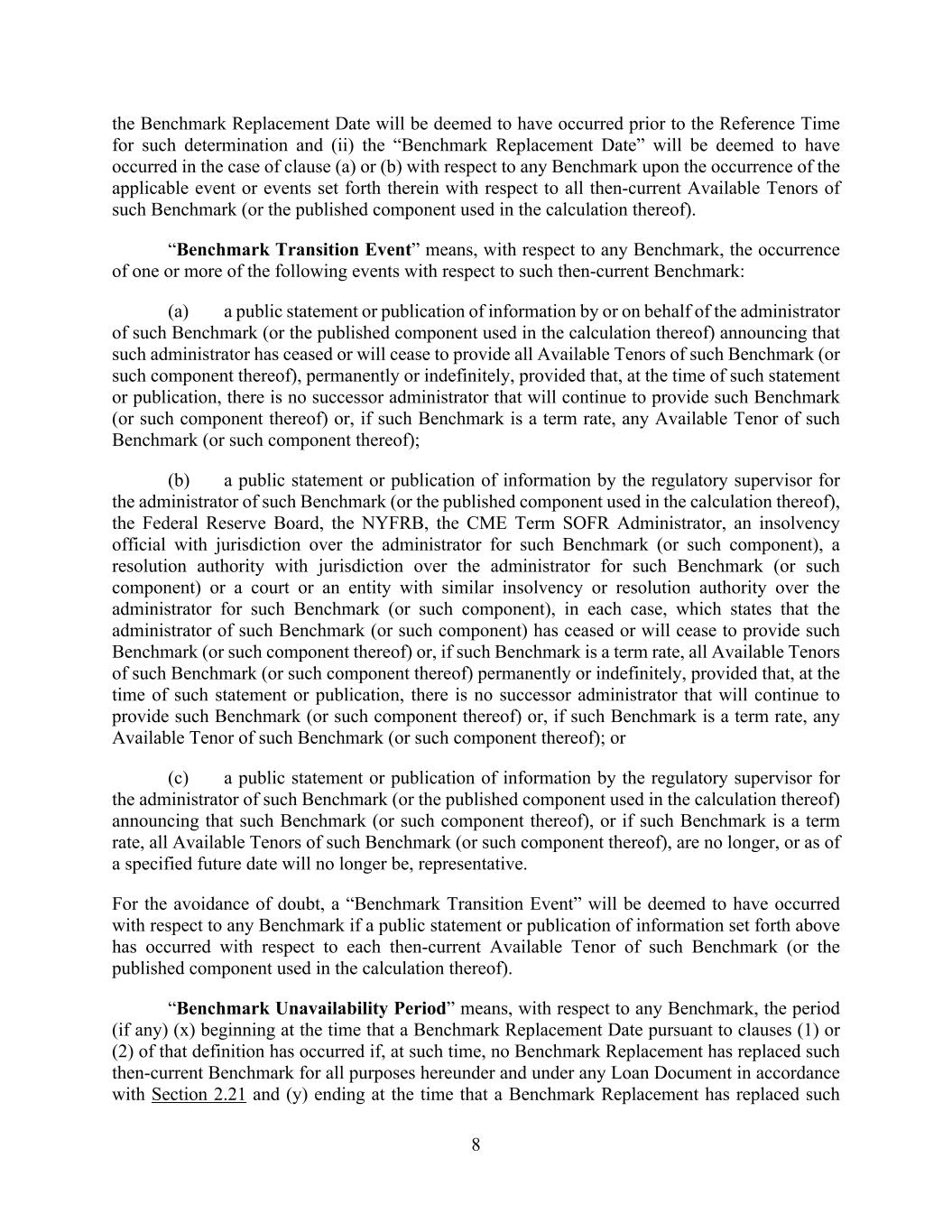 8 the Benchmark Replacement Date will be deemed to have occurred prior to the Reference Time for such determination and (ii) the “Benchmark Replacement Date” will be deemed to have occurred in the case of clause (a) or (b) with respect to any Benchmark upon the occurrence of the applicable event or events set forth therein with respect to all then-current Available Tenors of such Benchmark (or the published component used in the calculation thereof). “Benchmark Transition Event” means, with respect to any Benchmark, the occurrence of one or more of the following events with respect to such then-current Benchmark: (a) a public statement or publication of information by or on behalf of the administrator of such Benchmark (or the published component used in the calculation thereof) announcing that such administrator has ceased or will cease to provide all Available Tenors of such Benchmark (or such component thereof), permanently or indefinitely, provided that, at the time of such statement or publication, there is no successor administrator that will continue to provide such Benchmark (or such component thereof) or, if such Benchmark is a term rate, any Available Tenor of such Benchmark (or such component thereof); (b) a public statement or publication of information by the regulatory supervisor for the administrator of such Benchmark (or the published component used in the calculation thereof), the Federal Reserve Board, the NYFRB, the CME Term SOFR Administrator, an insolvency official with jurisdiction over the administrator for such Benchmark (or such component), a resolution authority with jurisdiction over the administrator for such Benchmark (or such component) or a court or an entity with similar insolvency or resolution authority over the administrator for such Benchmark (or such component), in each case, which states that the administrator of such Benchmark (or such component) has ceased or will cease to provide such Benchmark (or such component thereof) or, if such Benchmark is a term rate, all Available Tenors of such Benchmark (or such component thereof) permanently or indefinitely, provided that, at the time of such statement or publication, there is no successor administrator that will continue to provide such Benchmark (or such component thereof) or, if such Benchmark is a term rate, any Available Tenor of such Benchmark (or such component thereof); or (c) a public statement or publication of information by the regulatory supervisor for the administrator of such Benchmark (or the published component used in the calculation thereof) announcing that such Benchmark (or such component thereof), or if such Benchmark is a term rate, all Available Tenors of such Benchmark (or such component thereof), are no longer, or as of a specified future date will no longer be, representative. For the avoidance of doubt, a “Benchmark Transition Event” will be deemed to have occurred with respect to any Benchmark if a public statement or publication of information set forth above has occurred with respect to each then-current Available Tenor of such Benchmark (or the published component used in the calculation thereof). “Benchmark Unavailability Period” means, with respect to any Benchmark, the period (if any) (x) beginning at the time that a Benchmark Replacement Date pursuant to clauses (1) or (2) of that definition has occurred if, at such time, no Benchmark Replacement has replaced such then-current Benchmark for all purposes hereunder and under any Loan Document in accordance with Section 2.21 and (y) ending at the time that a Benchmark Replacement has replaced such