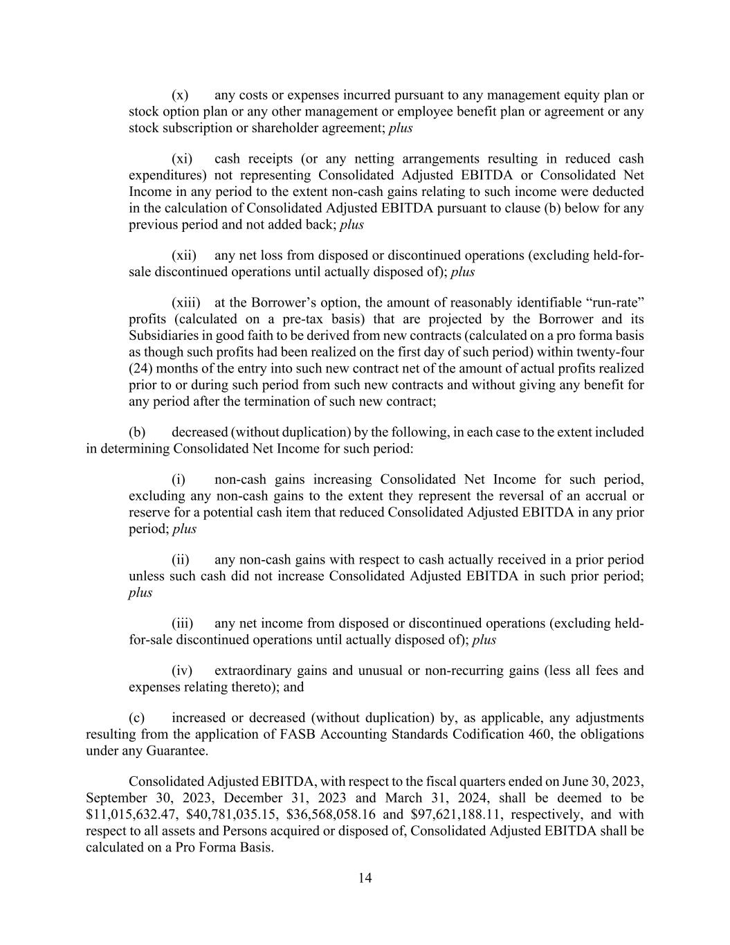 14 (x) any costs or expenses incurred pursuant to any management equity plan or stock option plan or any other management or employee benefit plan or agreement or any stock subscription or shareholder agreement; plus (xi) cash receipts (or any netting arrangements resulting in reduced cash expenditures) not representing Consolidated Adjusted EBITDA or Consolidated Net Income in any period to the extent non-cash gains relating to such income were deducted in the calculation of Consolidated Adjusted EBITDA pursuant to clause (b) below for any previous period and not added back; plus (xii) any net loss from disposed or discontinued operations (excluding held-for- sale discontinued operations until actually disposed of); plus (xiii) at the Borrower’s option, the amount of reasonably identifiable “run-rate” profits (calculated on a pre-tax basis) that are projected by the Borrower and its Subsidiaries in good faith to be derived from new contracts (calculated on a pro forma basis as though such profits had been realized on the first day of such period) within twenty-four (24) months of the entry into such new contract net of the amount of actual profits realized prior to or during such period from such new contracts and without giving any benefit for any period after the termination of such new contract; (b) decreased (without duplication) by the following, in each case to the extent included in determining Consolidated Net Income for such period: (i) non-cash gains increasing Consolidated Net Income for such period, excluding any non-cash gains to the extent they represent the reversal of an accrual or reserve for a potential cash item that reduced Consolidated Adjusted EBITDA in any prior period; plus (ii) any non-cash gains with respect to cash actually received in a prior period unless such cash did not increase Consolidated Adjusted EBITDA in such prior period; plus (iii) any net income from disposed or discontinued operations (excluding held- for-sale discontinued operations until actually disposed of); plus (iv) extraordinary gains and unusual or non-recurring gains (less all fees and expenses relating thereto); and (c) increased or decreased (without duplication) by, as applicable, any adjustments resulting from the application of FASB Accounting Standards Codification 460, the obligations under any Guarantee. Consolidated Adjusted EBITDA, with respect to the fiscal quarters ended on June 30, 2023, September 30, 2023, December 31, 2023 and March 31, 2024, shall be deemed to be $11,015,632.47, $40,781,035.15, $36,568,058.16 and $97,621,188.11, respectively, and with respect to all assets and Persons acquired or disposed of, Consolidated Adjusted EBITDA shall be calculated on a Pro Forma Basis.