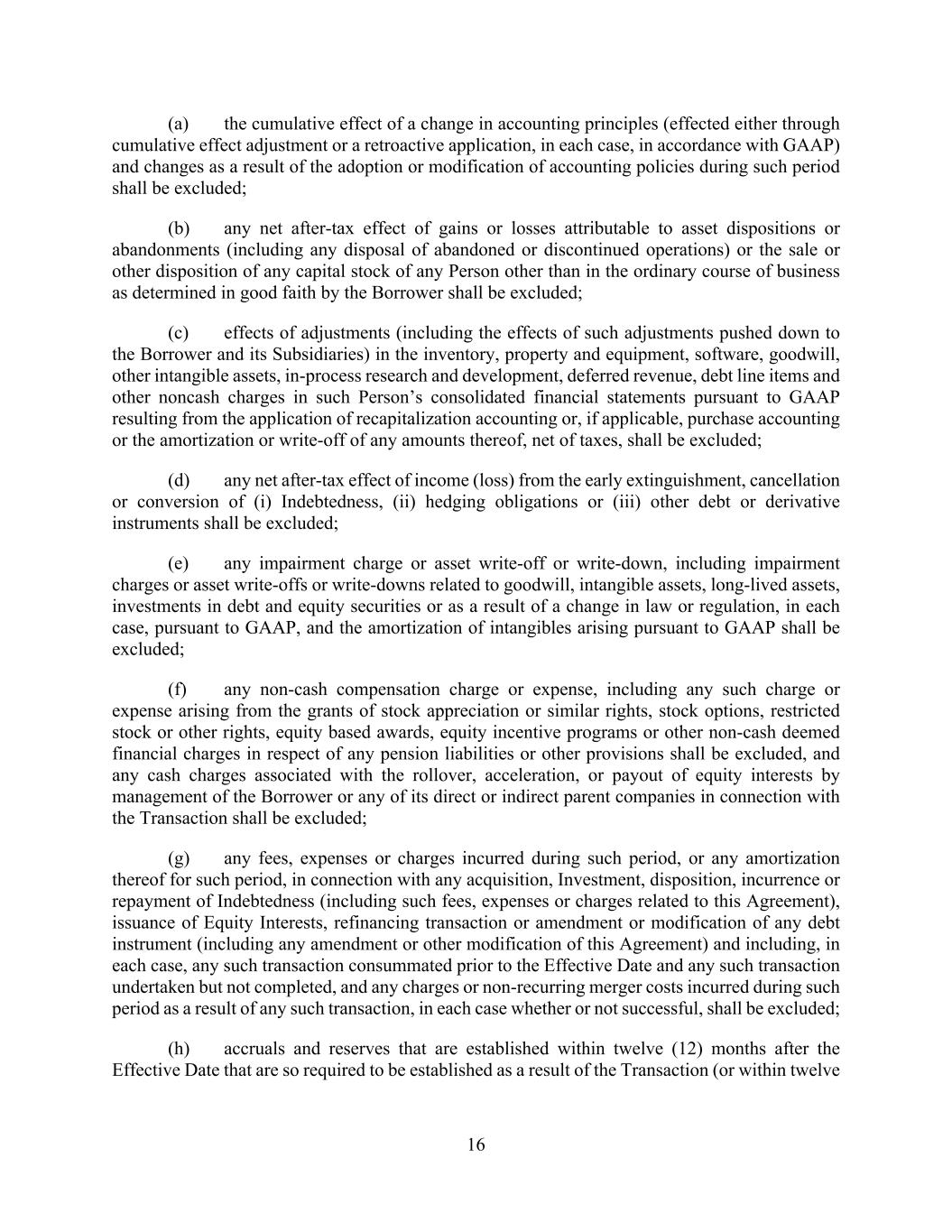 16 (a) the cumulative effect of a change in accounting principles (effected either through cumulative effect adjustment or a retroactive application, in each case, in accordance with GAAP) and changes as a result of the adoption or modification of accounting policies during such period shall be excluded; (b) any net after-tax effect of gains or losses attributable to asset dispositions or abandonments (including any disposal of abandoned or discontinued operations) or the sale or other disposition of any capital stock of any Person other than in the ordinary course of business as determined in good faith by the Borrower shall be excluded; (c) effects of adjustments (including the effects of such adjustments pushed down to the Borrower and its Subsidiaries) in the inventory, property and equipment, software, goodwill, other intangible assets, in-process research and development, deferred revenue, debt line items and other noncash charges in such Person’s consolidated financial statements pursuant to GAAP resulting from the application of recapitalization accounting or, if applicable, purchase accounting or the amortization or write-off of any amounts thereof, net of taxes, shall be excluded; (d) any net after-tax effect of income (loss) from the early extinguishment, cancellation or conversion of (i) Indebtedness, (ii) hedging obligations or (iii) other debt or derivative instruments shall be excluded; (e) any impairment charge or asset write-off or write-down, including impairment charges or asset write-offs or write-downs related to goodwill, intangible assets, long-lived assets, investments in debt and equity securities or as a result of a change in law or regulation, in each case, pursuant to GAAP, and the amortization of intangibles arising pursuant to GAAP shall be excluded; (f) any non-cash compensation charge or expense, including any such charge or expense arising from the grants of stock appreciation or similar rights, stock options, restricted stock or other rights, equity based awards, equity incentive programs or other non-cash deemed financial charges in respect of any pension liabilities or other provisions shall be excluded, and any cash charges associated with the rollover, acceleration, or payout of equity interests by management of the Borrower or any of its direct or indirect parent companies in connection with the Transaction shall be excluded; (g) any fees, expenses or charges incurred during such period, or any amortization thereof for such period, in connection with any acquisition, Investment, disposition, incurrence or repayment of Indebtedness (including such fees, expenses or charges related to this Agreement), issuance of Equity Interests, refinancing transaction or amendment or modification of any debt instrument (including any amendment or other modification of this Agreement) and including, in each case, any such transaction consummated prior to the Effective Date and any such transaction undertaken but not completed, and any charges or non-recurring merger costs incurred during such period as a result of any such transaction, in each case whether or not successful, shall be excluded; (h) accruals and reserves that are established within twelve (12) months after the Effective Date that are so required to be established as a result of the Transaction (or within twelve