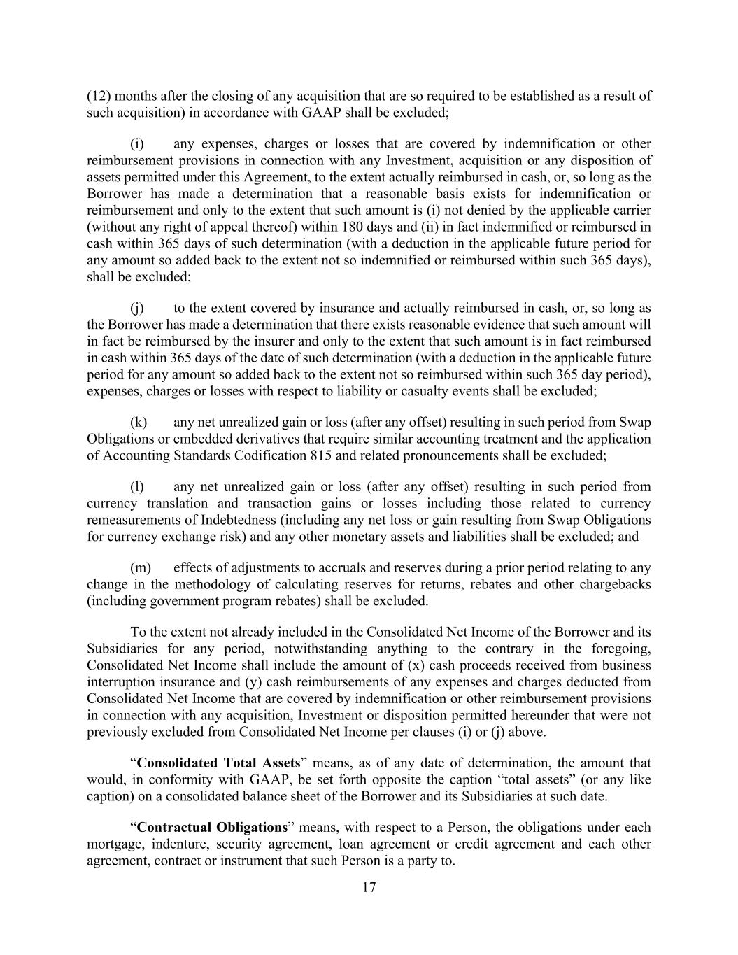 17 (12) months after the closing of any acquisition that are so required to be established as a result of such acquisition) in accordance with GAAP shall be excluded; (i) any expenses, charges or losses that are covered by indemnification or other reimbursement provisions in connection with any Investment, acquisition or any disposition of assets permitted under this Agreement, to the extent actually reimbursed in cash, or, so long as the Borrower has made a determination that a reasonable basis exists for indemnification or reimbursement and only to the extent that such amount is (i) not denied by the applicable carrier (without any right of appeal thereof) within 180 days and (ii) in fact indemnified or reimbursed in cash within 365 days of such determination (with a deduction in the applicable future period for any amount so added back to the extent not so indemnified or reimbursed within such 365 days), shall be excluded; (j) to the extent covered by insurance and actually reimbursed in cash, or, so long as the Borrower has made a determination that there exists reasonable evidence that such amount will in fact be reimbursed by the insurer and only to the extent that such amount is in fact reimbursed in cash within 365 days of the date of such determination (with a deduction in the applicable future period for any amount so added back to the extent not so reimbursed within such 365 day period), expenses, charges or losses with respect to liability or casualty events shall be excluded; (k) any net unrealized gain or loss (after any offset) resulting in such period from Swap Obligations or embedded derivatives that require similar accounting treatment and the application of Accounting Standards Codification 815 and related pronouncements shall be excluded; (l) any net unrealized gain or loss (after any offset) resulting in such period from currency translation and transaction gains or losses including those related to currency remeasurements of Indebtedness (including any net loss or gain resulting from Swap Obligations for currency exchange risk) and any other monetary assets and liabilities shall be excluded; and (m) effects of adjustments to accruals and reserves during a prior period relating to any change in the methodology of calculating reserves for returns, rebates and other chargebacks (including government program rebates) shall be excluded. To the extent not already included in the Consolidated Net Income of the Borrower and its Subsidiaries for any period, notwithstanding anything to the contrary in the foregoing, Consolidated Net Income shall include the amount of (x) cash proceeds received from business interruption insurance and (y) cash reimbursements of any expenses and charges deducted from Consolidated Net Income that are covered by indemnification or other reimbursement provisions in connection with any acquisition, Investment or disposition permitted hereunder that were not previously excluded from Consolidated Net Income per clauses (i) or (j) above. “Consolidated Total Assets” means, as of any date of determination, the amount that would, in conformity with GAAP, be set forth opposite the caption “total assets” (or any like caption) on a consolidated balance sheet of the Borrower and its Subsidiaries at such date. “Contractual Obligations” means, with respect to a Person, the obligations under each mortgage, indenture, security agreement, loan agreement or credit agreement and each other agreement, contract or instrument that such Person is a party to.