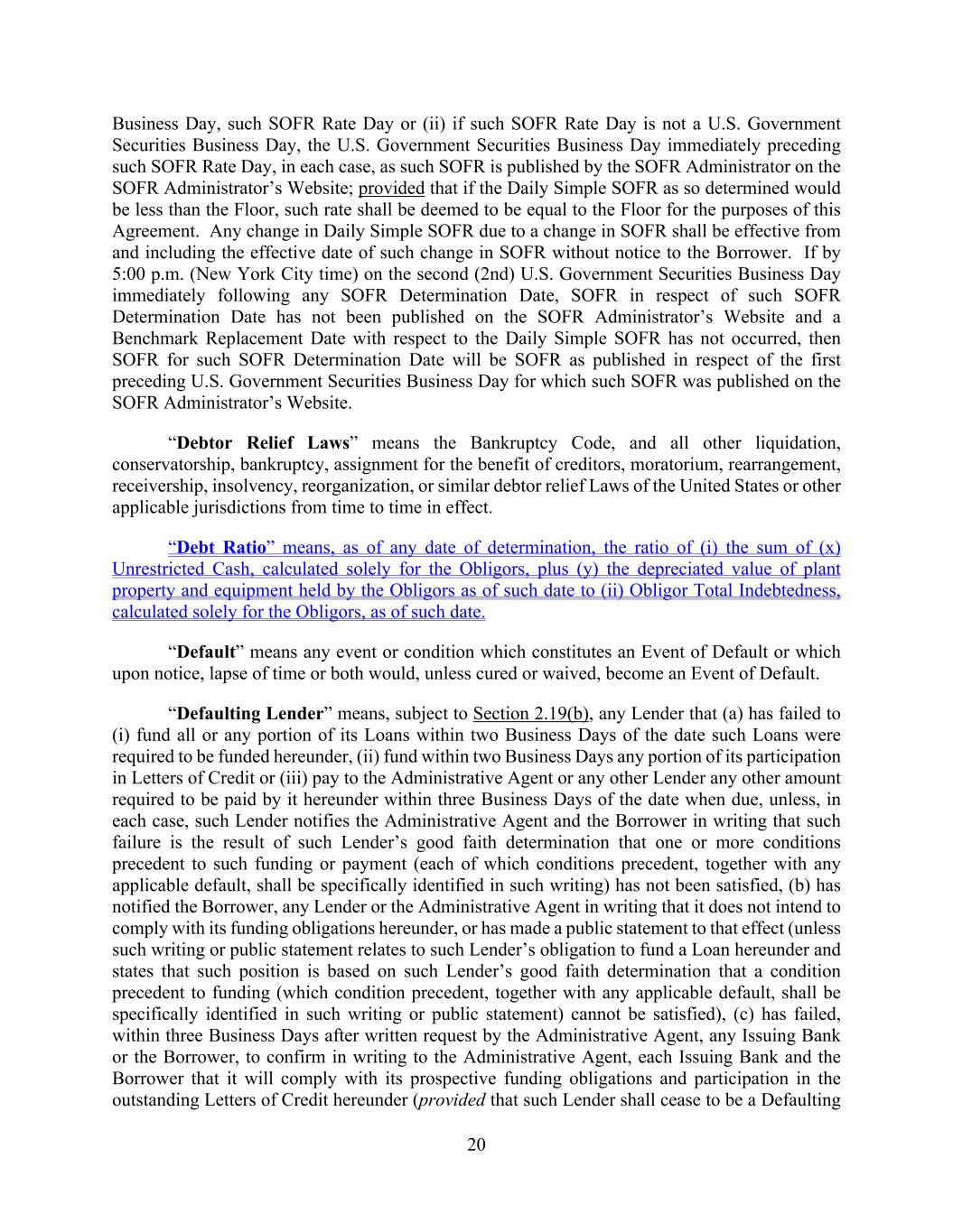 20 Business Day, such SOFR Rate Day or (ii) if such SOFR Rate Day is not a U.S. Government Securities Business Day, the U.S. Government Securities Business Day immediately preceding such SOFR Rate Day, in each case, as such SOFR is published by the SOFR Administrator on the SOFR Administrator’s Website; provided that if the Daily Simple SOFR as so determined would be less than the Floor, such rate shall be deemed to be equal to the Floor for the purposes of this Agreement. Any change in Daily Simple SOFR due to a change in SOFR shall be effective from and including the effective date of such change in SOFR without notice to the Borrower. If by 5:00 p.m. (New York City time) on the second (2nd) U.S. Government Securities Business Day immediately following any SOFR Determination Date, SOFR in respect of such SOFR Determination Date has not been published on the SOFR Administrator’s Website and a Benchmark Replacement Date with respect to the Daily Simple SOFR has not occurred, then SOFR for such SOFR Determination Date will be SOFR as published in respect of the first preceding U.S. Government Securities Business Day for which such SOFR was published on the SOFR Administrator’s Website. “Debtor Relief Laws” means the Bankruptcy Code, and all other liquidation, conservatorship, bankruptcy, assignment for the benefit of creditors, moratorium, rearrangement, receivership, insolvency, reorganization, or similar debtor relief Laws of the United States or other applicable jurisdictions from time to time in effect. “Debt Ratio” means, as of any date of determination, the ratio of (i) the sum of (x) Unrestricted Cash, calculated solely for the Obligors, plus (y) the depreciated value of plant property and equipment held by the Obligors as of such date to (ii) Obligor Total Indebtedness, calculated solely for the Obligors, as of such date. “Default” means any event or condition which constitutes an Event of Default or which upon notice, lapse of time or both would, unless cured or waived, become an Event of Default. “Defaulting Lender” means, subject to Section 2.19(b), any Lender that (a) has failed to (i) fund all or any portion of its Loans within two Business Days of the date such Loans were required to be funded hereunder, (ii) fund within two Business Days any portion of its participation in Letters of Credit or (iii) pay to the Administrative Agent or any other Lender any other amount required to be paid by it hereunder within three Business Days of the date when due, unless, in each case, such Lender notifies the Administrative Agent and the Borrower in writing that such failure is the result of such Lender’s good faith determination that one or more conditions precedent to such funding or payment (each of which conditions precedent, together with any applicable default, shall be specifically identified in such writing) has not been satisfied, (b) has notified the Borrower, any Lender or the Administrative Agent in writing that it does not intend to comply with its funding obligations hereunder, or has made a public statement to that effect (unless such writing or public statement relates to such Lender’s obligation to fund a Loan hereunder and states that such position is based on such Lender’s good faith determination that a condition precedent to funding (which condition precedent, together with any applicable default, shall be specifically identified in such writing or public statement) cannot be satisfied), (c) has failed, within three Business Days after written request by the Administrative Agent, any Issuing Bank or the Borrower, to confirm in writing to the Administrative Agent, each Issuing Bank and the Borrower that it will comply with its prospective funding obligations and participation in the outstanding Letters of Credit hereunder (provided that such Lender shall cease to be a Defaulting