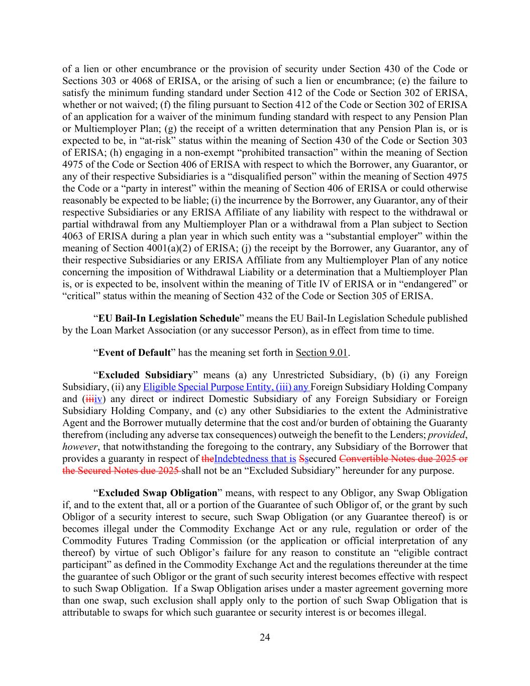 24 of a lien or other encumbrance or the provision of security under Section 430 of the Code or Sections 303 or 4068 of ERISA, or the arising of such a lien or encumbrance; (e) the failure to satisfy the minimum funding standard under Section 412 of the Code or Section 302 of ERISA, whether or not waived; (f) the filing pursuant to Section 412 of the Code or Section 302 of ERISA of an application for a waiver of the minimum funding standard with respect to any Pension Plan or Multiemployer Plan; (g) the receipt of a written determination that any Pension Plan is, or is expected to be, in “at-risk” status within the meaning of Section 430 of the Code or Section 303 of ERISA; (h) engaging in a non-exempt “prohibited transaction” within the meaning of Section 4975 of the Code or Section 406 of ERISA with respect to which the Borrower, any Guarantor, or any of their respective Subsidiaries is a “disqualified person” within the meaning of Section 4975 the Code or a “party in interest” within the meaning of Section 406 of ERISA or could otherwise reasonably be expected to be liable; (i) the incurrence by the Borrower, any Guarantor, any of their respective Subsidiaries or any ERISA Affiliate of any liability with respect to the withdrawal or partial withdrawal from any Multiemployer Plan or a withdrawal from a Plan subject to Section 4063 of ERISA during a plan year in which such entity was a “substantial employer” within the meaning of Section 4001(a)(2) of ERISA; (j) the receipt by the Borrower, any Guarantor, any of their respective Subsidiaries or any ERISA Affiliate from any Multiemployer Plan of any notice concerning the imposition of Withdrawal Liability or a determination that a Multiemployer Plan is, or is expected to be, insolvent within the meaning of Title IV of ERISA or in “endangered” or “critical” status within the meaning of Section 432 of the Code or Section 305 of ERISA. “EU Bail-In Legislation Schedule” means the EU Bail-In Legislation Schedule published by the Loan Market Association (or any successor Person), as in effect from time to time. “Event of Default” has the meaning set forth in Section 9.01. “Excluded Subsidiary” means (a) any Unrestricted Subsidiary, (b) (i) any Foreign Subsidiary, (ii) any Eligible Special Purpose Entity, (iii) any Foreign Subsidiary Holding Company and (iiiiv) any direct or indirect Domestic Subsidiary of any Foreign Subsidiary or Foreign Subsidiary Holding Company, and (c) any other Subsidiaries to the extent the Administrative Agent and the Borrower mutually determine that the cost and/or burden of obtaining the Guaranty therefrom (including any adverse tax consequences) outweigh the benefit to the Lenders; provided, however, that notwithstanding the foregoing to the contrary, any Subsidiary of the Borrower that provides a guaranty in respect of theIndebtedness that is Ssecured Convertible Notes due 2025 or the Secured Notes due 2025 shall not be an “Excluded Subsidiary” hereunder for any purpose. “Excluded Swap Obligation” means, with respect to any Obligor, any Swap Obligation if, and to the extent that, all or a portion of the Guarantee of such Obligor of, or the grant by such Obligor of a security interest to secure, such Swap Obligation (or any Guarantee thereof) is or becomes illegal under the Commodity Exchange Act or any rule, regulation or order of the Commodity Futures Trading Commission (or the application or official interpretation of any thereof) by virtue of such Obligor’s failure for any reason to constitute an “eligible contract participant” as defined in the Commodity Exchange Act and the regulations thereunder at the time the guarantee of such Obligor or the grant of such security interest becomes effective with respect to such Swap Obligation. If a Swap Obligation arises under a master agreement governing more than one swap, such exclusion shall apply only to the portion of such Swap Obligation that is attributable to swaps for which such guarantee or security interest is or becomes illegal.