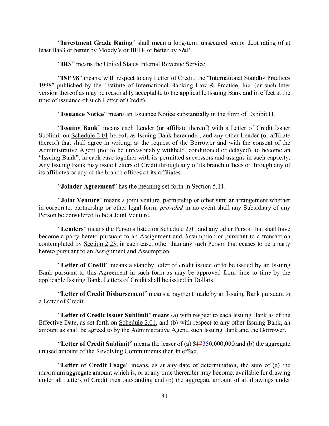 31 “Investment Grade Rating” shall mean a long-term unsecured senior debt rating of at least Baa3 or better by Moody’s or BBB- or better by S&P. “IRS” means the United States Internal Revenue Service. “ISP 98” means, with respect to any Letter of Credit, the “International Standby Practices 1998” published by the Institute of International Banking Law & Practice, Inc. (or such later version thereof as may be reasonably acceptable to the applicable Issuing Bank and in effect at the time of issuance of such Letter of Credit). “Issuance Notice” means an Issuance Notice substantially in the form of Exhibit H. “Issuing Bank” means each Lender (or affiliate thereof) with a Letter of Credit Issuer Sublimit on Schedule 2.01 hereof, as Issuing Bank hereunder, and any other Lender (or affiliate thereof) that shall agree in writing, at the request of the Borrower and with the consent of the Administrative Agent (not to be unreasonably withheld, conditioned or delayed), to become an “Issuing Bank”, in each case together with its permitted successors and assigns in such capacity. Any Issuing Bank may issue Letters of Credit through any of its branch offices or through any of its affiliates or any of the branch offices of its affiliates. “Joinder Agreement” has the meaning set forth in Section 5.11. “Joint Venture” means a joint venture, partnership or other similar arrangement whether in corporate, partnership or other legal form; provided in no event shall any Subsidiary of any Person be considered to be a Joint Venture. “Lenders” means the Persons listed on Schedule 2.01 and any other Person that shall have become a party hereto pursuant to an Assignment and Assumption or pursuant to a transaction contemplated by Section 2.23, in each case, other than any such Person that ceases to be a party hereto pursuant to an Assignment and Assumption. “Letter of Credit” means a standby letter of credit issued or to be issued by an Issuing Bank pursuant to this Agreement in such form as may be approved from time to time by the applicable Issuing Bank. Letters of Credit shall be issued in Dollars. “Letter of Credit Disbursement” means a payment made by an Issuing Bank pursuant to a Letter of Credit. “Letter of Credit Issuer Sublimit” means (a) with respect to each Issuing Bank as of the Effective Date, as set forth on Schedule 2.01, and (b) with respect to any other Issuing Bank, an amount as shall be agreed to by the Administrative Agent, such Issuing Bank and the Borrower. “Letter of Credit Sublimit” means the lesser of (a) $17350,000,000 and (b) the aggregate unused amount of the Revolving Commitments then in effect. “Letter of Credit Usage” means, as at any date of determination, the sum of (a) the maximum aggregate amount which is, or at any time thereafter may become, available for drawing under all Letters of Credit then outstanding and (b) the aggregate amount of all drawings under