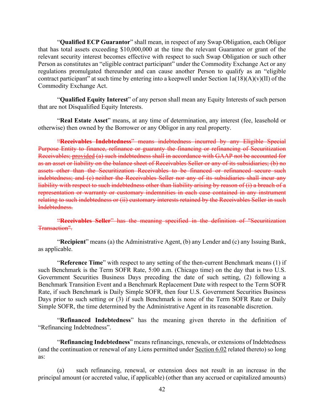 42 “Qualified ECP Guarantor” shall mean, in respect of any Swap Obligation, each Obligor that has total assets exceeding $10,000,000 at the time the relevant Guarantee or grant of the relevant security interest becomes effective with respect to such Swap Obligation or such other Person as constitutes an “eligible contract participant” under the Commodity Exchange Act or any regulations promulgated thereunder and can cause another Person to qualify as an “eligible contract participant” at such time by entering into a keepwell under Section 1a(18)(A)(v)(II) of the Commodity Exchange Act. “Qualified Equity Interest” of any person shall mean any Equity Interests of such person that are not Disqualified Equity Interests. “Real Estate Asset” means, at any time of determination, any interest (fee, leasehold or otherwise) then owned by the Borrower or any Obligor in any real property. “Receivables Indebtedness” means indebtedness incurred by any Eligible Special Purpose Entity to finance, refinance or guaranty the financing or refinancing of Securitization Receivables; provided (a) such indebtedness shall in accordance with GAAP not be accounted for as an asset or liability on the balance sheet of Receivables Seller or any of its subsidiaries; (b) no assets other than the Securitization Receivables to be financed or refinanced secure such indebtedness; and (c) neither the Receivables Seller nor any of its subsidiaries shall incur any liability with respect to such indebtedness other than liability arising by reason of (i) a breach of a representation or warranty or customary indemnities in each case contained in any instrument relating to such indebtedness or (ii) customary interests retained by the Receivables Seller in such Indebtedness. “Receivables Seller” has the meaning specified in the definition of "Securitization Transaction". “Recipient” means (a) the Administrative Agent, (b) any Lender and (c) any Issuing Bank, as applicable. “Reference Time” with respect to any setting of the then-current Benchmark means (1) if such Benchmark is the Term SOFR Rate, 5:00 a.m. (Chicago time) on the day that is two U.S. Government Securities Business Days preceding the date of such setting, (2) following a Benchmark Transition Event and a Benchmark Replacement Date with respect to the Term SOFR Rate, if such Benchmark is Daily Simple SOFR, then four U.S. Government Securities Business Days prior to such setting or (3) if such Benchmark is none of the Term SOFR Rate or Daily Simple SOFR, the time determined by the Administrative Agent in its reasonable discretion. “Refinanced Indebtedness” has the meaning given thereto in the definition of “Refinancing Indebtedness”. “Refinancing Indebtedness” means refinancings, renewals, or extensions of Indebtedness (and the continuation or renewal of any Liens permitted under Section 6.02 related thereto) so long as: (a) such refinancing, renewal, or extension does not result in an increase in the principal amount (or accreted value, if applicable) (other than any accrued or capitalized amounts)