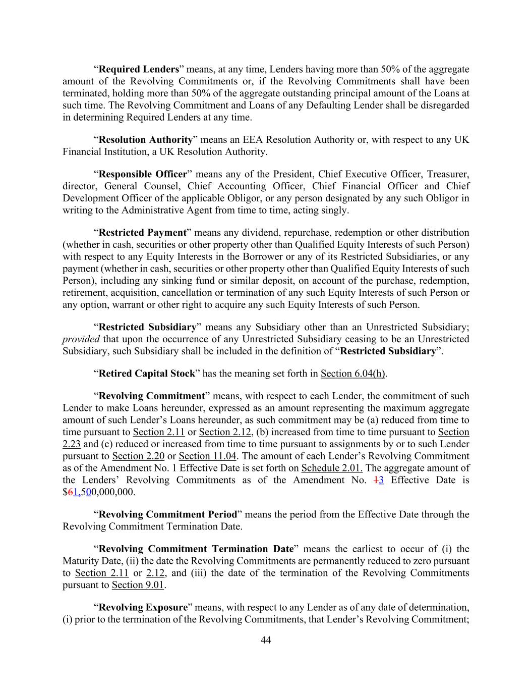 44 “Required Lenders” means, at any time, Lenders having more than 50% of the aggregate amount of the Revolving Commitments or, if the Revolving Commitments shall have been terminated, holding more than 50% of the aggregate outstanding principal amount of the Loans at such time. The Revolving Commitment and Loans of any Defaulting Lender shall be disregarded in determining Required Lenders at any time. “Resolution Authority” means an EEA Resolution Authority or, with respect to any UK Financial Institution, a UK Resolution Authority. “Responsible Officer” means any of the President, Chief Executive Officer, Treasurer, director, General Counsel, Chief Accounting Officer, Chief Financial Officer and Chief Development Officer of the applicable Obligor, or any person designated by any such Obligor in writing to the Administrative Agent from time to time, acting singly. “Restricted Payment” means any dividend, repurchase, redemption or other distribution (whether in cash, securities or other property other than Qualified Equity Interests of such Person) with respect to any Equity Interests in the Borrower or any of its Restricted Subsidiaries, or any payment (whether in cash, securities or other property other than Qualified Equity Interests of such Person), including any sinking fund or similar deposit, on account of the purchase, redemption, retirement, acquisition, cancellation or termination of any such Equity Interests of such Person or any option, warrant or other right to acquire any such Equity Interests of such Person. “Restricted Subsidiary” means any Subsidiary other than an Unrestricted Subsidiary; provided that upon the occurrence of any Unrestricted Subsidiary ceasing to be an Unrestricted Subsidiary, such Subsidiary shall be included in the definition of “Restricted Subsidiary”. “Retired Capital Stock” has the meaning set forth in Section 6.04(h). “Revolving Commitment” means, with respect to each Lender, the commitment of such Lender to make Loans hereunder, expressed as an amount representing the maximum aggregate amount of such Lender’s Loans hereunder, as such commitment may be (a) reduced from time to time pursuant to Section 2.11 or Section 2.12, (b) increased from time to time pursuant to Section 2.23 and (c) reduced or increased from time to time pursuant to assignments by or to such Lender pursuant to Section 2.20 or Section 11.04. The amount of each Lender’s Revolving Commitment as of the Amendment No. 1 Effective Date is set forth on Schedule 2.01. The aggregate amount of the Lenders’ Revolving Commitments as of the Amendment No. 13 Effective Date is $61,500,000,000. “Revolving Commitment Period” means the period from the Effective Date through the Revolving Commitment Termination Date. “Revolving Commitment Termination Date” means the earliest to occur of (i) the Maturity Date, (ii) the date the Revolving Commitments are permanently reduced to zero pursuant to Section 2.11 or 2.12, and (iii) the date of the termination of the Revolving Commitments pursuant to Section 9.01. “Revolving Exposure” means, with respect to any Lender as of any date of determination, (i) prior to the termination of the Revolving Commitments, that Lender’s Revolving Commitment;