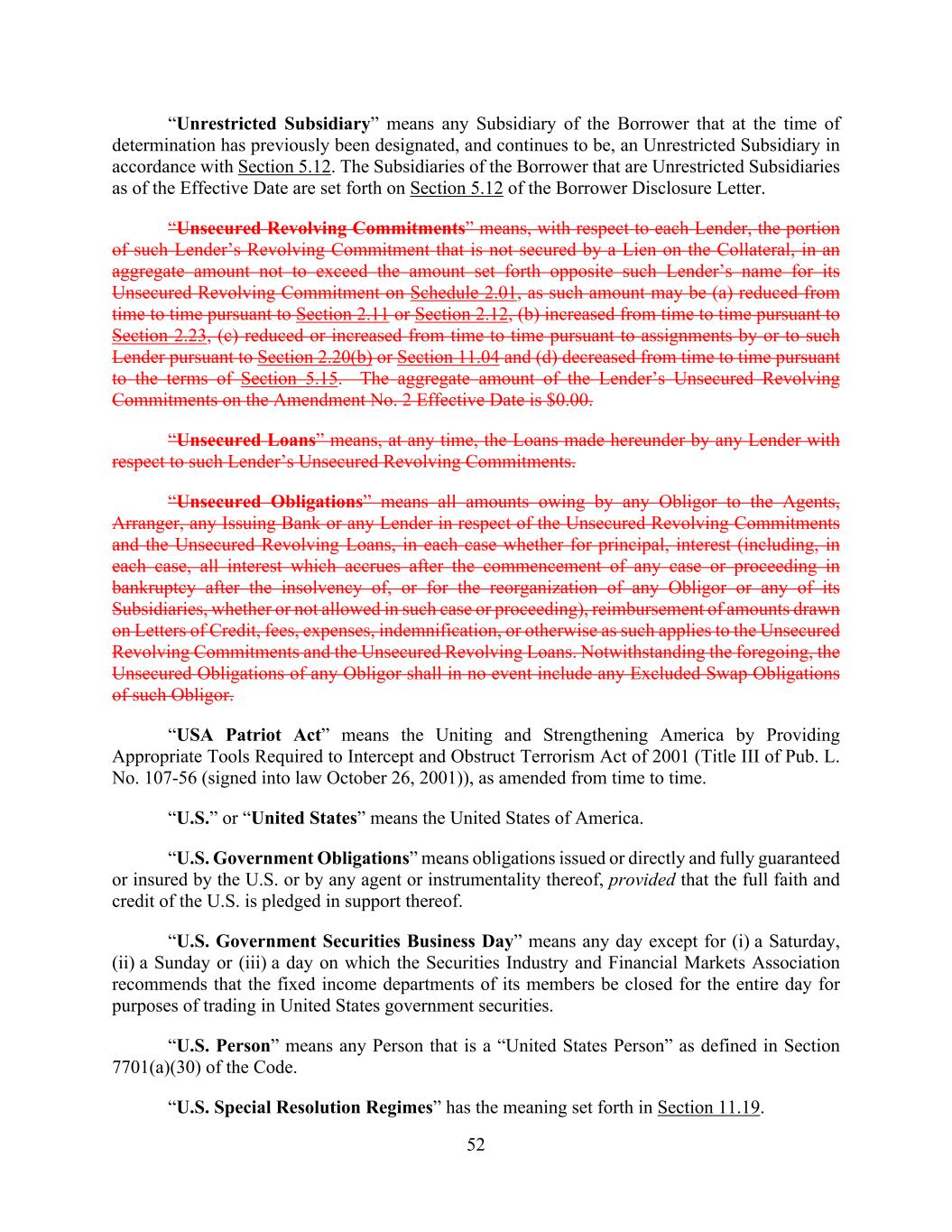 52 “Unrestricted Subsidiary” means any Subsidiary of the Borrower that at the time of determination has previously been designated, and continues to be, an Unrestricted Subsidiary in accordance with Section 5.12. The Subsidiaries of the Borrower that are Unrestricted Subsidiaries as of the Effective Date are set forth on Section 5.12 of the Borrower Disclosure Letter. “Unsecured Revolving Commitments” means, with respect to each Lender, the portion of such Lender’s Revolving Commitment that is not secured by a Lien on the Collateral, in an aggregate amount not to exceed the amount set forth opposite such Lender’s name for its Unsecured Revolving Commitment on Schedule 2.01, as such amount may be (a) reduced from time to time pursuant to Section 2.11 or Section 2.12, (b) increased from time to time pursuant to Section 2.23, (c) reduced or increased from time to time pursuant to assignments by or to such Lender pursuant to Section 2.20(b) or Section 11.04 and (d) decreased from time to time pursuant to the terms of Section 5.15. The aggregate amount of the Lender’s Unsecured Revolving Commitments on the Amendment No. 2 Effective Date is $0.00. “Unsecured Loans” means, at any time, the Loans made hereunder by any Lender with respect to such Lender’s Unsecured Revolving Commitments. “Unsecured Obligations” means all amounts owing by any Obligor to the Agents, Arranger, any Issuing Bank or any Lender in respect of the Unsecured Revolving Commitments and the Unsecured Revolving Loans, in each case whether for principal, interest (including, in each case, all interest which accrues after the commencement of any case or proceeding in bankruptcy after the insolvency of, or for the reorganization of any Obligor or any of its Subsidiaries, whether or not allowed in such case or proceeding), reimbursement of amounts drawn on Letters of Credit, fees, expenses, indemnification, or otherwise as such applies to the Unsecured Revolving Commitments and the Unsecured Revolving Loans. Notwithstanding the foregoing, the Unsecured Obligations of any Obligor shall in no event include any Excluded Swap Obligations of such Obligor. “USA Patriot Act” means the Uniting and Strengthening America by Providing Appropriate Tools Required to Intercept and Obstruct Terrorism Act of 2001 (Title III of Pub. L. No. 107-56 (signed into law October 26, 2001)), as amended from time to time. “U.S.” or “United States” means the United States of America. “U.S. Government Obligations” means obligations issued or directly and fully guaranteed or insured by the U.S. or by any agent or instrumentality thereof, provided that the full faith and credit of the U.S. is pledged in support thereof. “U.S. Government Securities Business Day” means any day except for (i) a Saturday, (ii) a Sunday or (iii) a day on which the Securities Industry and Financial Markets Association recommends that the fixed income departments of its members be closed for the entire day for purposes of trading in United States government securities. “U.S. Person” means any Person that is a “United States Person” as defined in Section 7701(a)(30) of the Code. “U.S. Special Resolution Regimes” has the meaning set forth in Section 11.19.