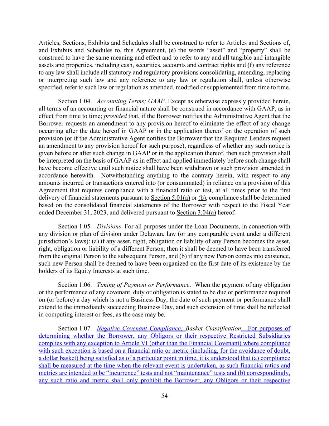 54 Articles, Sections, Exhibits and Schedules shall be construed to refer to Articles and Sections of, and Exhibits and Schedules to, this Agreement, (e) the words “asset” and “property” shall be construed to have the same meaning and effect and to refer to any and all tangible and intangible assets and properties, including cash, securities, accounts and contract rights and (f) any reference to any law shall include all statutory and regulatory provisions consolidating, amending, replacing or interpreting such law and any reference to any law or regulation shall, unless otherwise specified, refer to such law or regulation as amended, modified or supplemented from time to time. Section 1.04. Accounting Terms; GAAP. Except as otherwise expressly provided herein, all terms of an accounting or financial nature shall be construed in accordance with GAAP, as in effect from time to time; provided that, if the Borrower notifies the Administrative Agent that the Borrower requests an amendment to any provision hereof to eliminate the effect of any change occurring after the date hereof in GAAP or in the application thereof on the operation of such provision (or if the Administrative Agent notifies the Borrower that the Required Lenders request an amendment to any provision hereof for such purpose), regardless of whether any such notice is given before or after such change in GAAP or in the application thereof, then such provision shall be interpreted on the basis of GAAP as in effect and applied immediately before such change shall have become effective until such notice shall have been withdrawn or such provision amended in accordance herewith. Notwithstanding anything to the contrary herein, with respect to any amounts incurred or transactions entered into (or consummated) in reliance on a provision of this Agreement that requires compliance with a financial ratio or test, at all times prior to the first delivery of financial statements pursuant to Section 5.01(a) or (b), compliance shall be determined based on the consolidated financial statements of the Borrower with respect to the Fiscal Year ended December 31, 2023, and delivered pursuant to Section 3.04(a) hereof. Section 1.05. Divisions. For all purposes under the Loan Documents, in connection with any division or plan of division under Delaware law (or any comparable event under a different jurisdiction’s laws): (a) if any asset, right, obligation or liability of any Person becomes the asset, right, obligation or liability of a different Person, then it shall be deemed to have been transferred from the original Person to the subsequent Person, and (b) if any new Person comes into existence, such new Person shall be deemed to have been organized on the first date of its existence by the holders of its Equity Interests at such time. Section 1.06. Timing of Payment or Performance. When the payment of any obligation or the performance of any covenant, duty or obligation is stated to be due or performance required on (or before) a day which is not a Business Day, the date of such payment or performance shall extend to the immediately succeeding Business Day, and such extension of time shall be reflected in computing interest or fees, as the case may be. Section 1.07. Negative Covenant Compliance; Basket Classification. For purposes of determining whether the Borrower, any Obligors or their respective Restricted Subsidiaries complies with any exception to Article VI (other than the Financial Covenant) where compliance with such exception is based on a financial ratio or metric (including, for the avoidance of doubt, a dollar basket) being satisfied as of a particular point in time, it is understood that (a) compliance shall be measured at the time when the relevant event is undertaken, as such financial ratios and metrics are intended to be “incurrence” tests and not “maintenance” tests and (b) correspondingly, any such ratio and metric shall only prohibit the Borrower, any Obligors or their respective