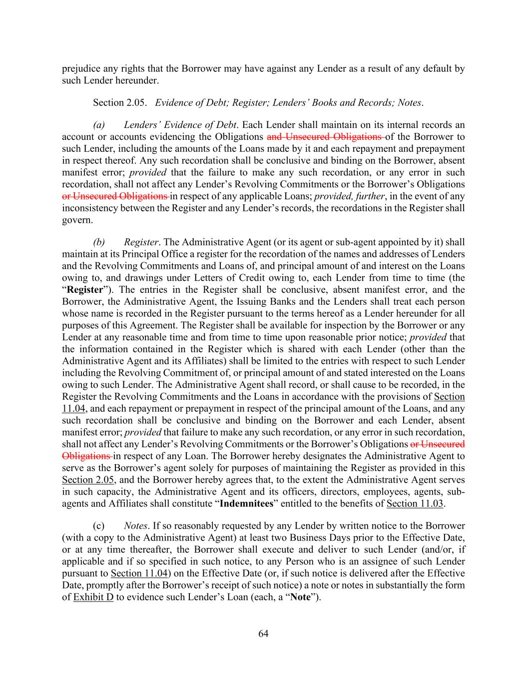 64 prejudice any rights that the Borrower may have against any Lender as a result of any default by such Lender hereunder. Section 2.05. Evidence of Debt; Register; Lenders’ Books and Records; Notes. (a) Lenders’ Evidence of Debt. Each Lender shall maintain on its internal records an account or accounts evidencing the Obligations and Unsecured Obligations of the Borrower to such Lender, including the amounts of the Loans made by it and each repayment and prepayment in respect thereof. Any such recordation shall be conclusive and binding on the Borrower, absent manifest error; provided that the failure to make any such recordation, or any error in such recordation, shall not affect any Lender’s Revolving Commitments or the Borrower’s Obligations or Unsecured Obligations in respect of any applicable Loans; provided, further, in the event of any inconsistency between the Register and any Lender’s records, the recordations in the Register shall govern. (b) Register. The Administrative Agent (or its agent or sub-agent appointed by it) shall maintain at its Principal Office a register for the recordation of the names and addresses of Lenders and the Revolving Commitments and Loans of, and principal amount of and interest on the Loans owing to, and drawings under Letters of Credit owing to, each Lender from time to time (the “Register”). The entries in the Register shall be conclusive, absent manifest error, and the Borrower, the Administrative Agent, the Issuing Banks and the Lenders shall treat each person whose name is recorded in the Register pursuant to the terms hereof as a Lender hereunder for all purposes of this Agreement. The Register shall be available for inspection by the Borrower or any Lender at any reasonable time and from time to time upon reasonable prior notice; provided that the information contained in the Register which is shared with each Lender (other than the Administrative Agent and its Affiliates) shall be limited to the entries with respect to such Lender including the Revolving Commitment of, or principal amount of and stated interested on the Loans owing to such Lender. The Administrative Agent shall record, or shall cause to be recorded, in the Register the Revolving Commitments and the Loans in accordance with the provisions of Section 11.04, and each repayment or prepayment in respect of the principal amount of the Loans, and any such recordation shall be conclusive and binding on the Borrower and each Lender, absent manifest error; provided that failure to make any such recordation, or any error in such recordation, shall not affect any Lender’s Revolving Commitments or the Borrower’s Obligations or Unsecured Obligations in respect of any Loan. The Borrower hereby designates the Administrative Agent to serve as the Borrower’s agent solely for purposes of maintaining the Register as provided in this Section 2.05, and the Borrower hereby agrees that, to the extent the Administrative Agent serves in such capacity, the Administrative Agent and its officers, directors, employees, agents, sub- agents and Affiliates shall constitute “Indemnitees” entitled to the benefits of Section 11.03. (c) Notes. If so reasonably requested by any Lender by written notice to the Borrower (with a copy to the Administrative Agent) at least two Business Days prior to the Effective Date, or at any time thereafter, the Borrower shall execute and deliver to such Lender (and/or, if applicable and if so specified in such notice, to any Person who is an assignee of such Lender pursuant to Section 11.04) on the Effective Date (or, if such notice is delivered after the Effective Date, promptly after the Borrower’s receipt of such notice) a note or notes in substantially the form of Exhibit D to evidence such Lender’s Loan (each, a “Note”).