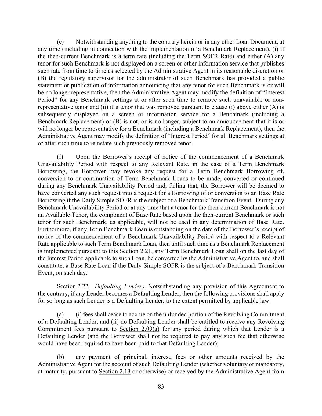 83 (e) Notwithstanding anything to the contrary herein or in any other Loan Document, at any time (including in connection with the implementation of a Benchmark Replacement), (i) if the then-current Benchmark is a term rate (including the Term SOFR Rate) and either (A) any tenor for such Benchmark is not displayed on a screen or other information service that publishes such rate from time to time as selected by the Administrative Agent in its reasonable discretion or (B) the regulatory supervisor for the administrator of such Benchmark has provided a public statement or publication of information announcing that any tenor for such Benchmark is or will be no longer representative, then the Administrative Agent may modify the definition of “Interest Period” for any Benchmark settings at or after such time to remove such unavailable or non- representative tenor and (ii) if a tenor that was removed pursuant to clause (i) above either (A) is subsequently displayed on a screen or information service for a Benchmark (including a Benchmark Replacement) or (B) is not, or is no longer, subject to an announcement that it is or will no longer be representative for a Benchmark (including a Benchmark Replacement), then the Administrative Agent may modify the definition of “Interest Period” for all Benchmark settings at or after such time to reinstate such previously removed tenor. (f) Upon the Borrower’s receipt of notice of the commencement of a Benchmark Unavailability Period with respect to any Relevant Rate, in the case of a Term Benchmark Borrowing, the Borrower may revoke any request for a Term Benchmark Borrowing of, conversion to or continuation of Term Benchmark Loans to be made, converted or continued during any Benchmark Unavailability Period and, failing that, the Borrower will be deemed to have converted any such request into a request for a Borrowing of or conversion to an Base Rate Borrowing if the Daily Simple SOFR is the subject of a Benchmark Transition Event. During any Benchmark Unavailability Period or at any time that a tenor for the then-current Benchmark is not an Available Tenor, the component of Base Rate based upon the then-current Benchmark or such tenor for such Benchmark, as applicable, will not be used in any determination of Base Rate. Furthermore, if any Term Benchmark Loan is outstanding on the date of the Borrower’s receipt of notice of the commencement of a Benchmark Unavailability Period with respect to a Relevant Rate applicable to such Term Benchmark Loan, then until such time as a Benchmark Replacement is implemented pursuant to this Section 2.21, any Term Benchmark Loan shall on the last day of the Interest Period applicable to such Loan, be converted by the Administrative Agent to, and shall constitute, a Base Rate Loan if the Daily Simple SOFR is the subject of a Benchmark Transition Event, on such day. Section 2.22. Defaulting Lenders. Notwithstanding any provision of this Agreement to the contrary, if any Lender becomes a Defaulting Lender, then the following provisions shall apply for so long as such Lender is a Defaulting Lender, to the extent permitted by applicable law: (a) (i) fees shall cease to accrue on the unfunded portion of the Revolving Commitment of a Defaulting Lender, and (ii) no Defaulting Lender shall be entitled to receive any Revolving Commitment fees pursuant to Section 2.09(a) for any period during which that Lender is a Defaulting Lender (and the Borrower shall not be required to pay any such fee that otherwise would have been required to have been paid to that Defaulting Lender); (b) any payment of principal, interest, fees or other amounts received by the Administrative Agent for the account of such Defaulting Lender (whether voluntary or mandatory, at maturity, pursuant to Section 2.13 or otherwise) or received by the Administrative Agent from