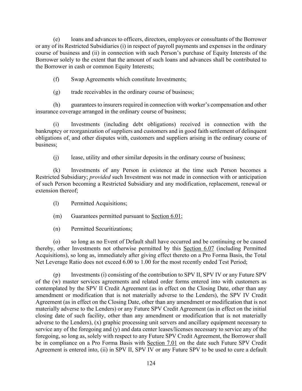124 (e) loans and advances to officers, directors, employees or consultants of the Borrower or any of its Restricted Subsidiaries (i) in respect of payroll payments and expenses in the ordinary course of business and (ii) in connection with such Person’s purchase of Equity Interests of the Borrower solely to the extent that the amount of such loans and advances shall be contributed to the Borrower in cash or common Equity Interests; (f) Swap Agreements which constitute Investments; (g) trade receivables in the ordinary course of business; (h) guarantees to insurers required in connection with worker’s compensation and other insurance coverage arranged in the ordinary course of business; (i) Investments (including debt obligations) received in connection with the bankruptcy or reorganization of suppliers and customers and in good faith settlement of delinquent obligations of, and other disputes with, customers and suppliers arising in the ordinary course of business; (j) lease, utility and other similar deposits in the ordinary course of business; (k) Investments of any Person in existence at the time such Person becomes a Restricted Subsidiary; provided such Investment was not made in connection with or anticipation of such Person becoming a Restricted Subsidiary and any modification, replacement, renewal or extension thereof; (l) Permitted Acquisitions; (m) Guarantees permitted pursuant to Section 6.01; (n) Permitted Securitizations; (o) so long as no Event of Default shall have occurred and be continuing or be caused thereby, other Investments not otherwise permitted by this Section 6.07 (including Permitted Acquisitions), so long as, immediately after giving effect thereto on a Pro Forma Basis, the Total Net Leverage Ratio does not exceed 6.00 to 1.00 for the most recently ended Test Period; (p) Investments (i) consisting of the contribution to SPV II, SPV IV or any Future SPV of the (w) master services agreements and related order forms entered into with customers as contemplated by the SPV II Credit Agreement (as in effect on the Closing Date, other than any amendment or modification that is not materially adverse to the Lenders), the SPV IV Credit Agreement (as in effect on the Closing Date, other than any amendment or modification that is not materially adverse to the Lenders) or any Future SPV Credit Agreement (as in effect on the initial closing date of such facility, other than any amendment or modification that is not materially adverse to the Lenders), (x) graphic processing unit servers and ancillary equipment necessary to service any of the foregoing and (y) and data center leases/licenses necessary to service any of the foregoing, so long as, solely with respect to any Future SPV Credit Agreement, the Borrower shall be in compliance on a Pro Forma Basis with Section 7.01 on the date such Future SPV Credit Agreement is entered into, (ii) in SPV II, SPV IV or any Future SPV to be used to cure a default