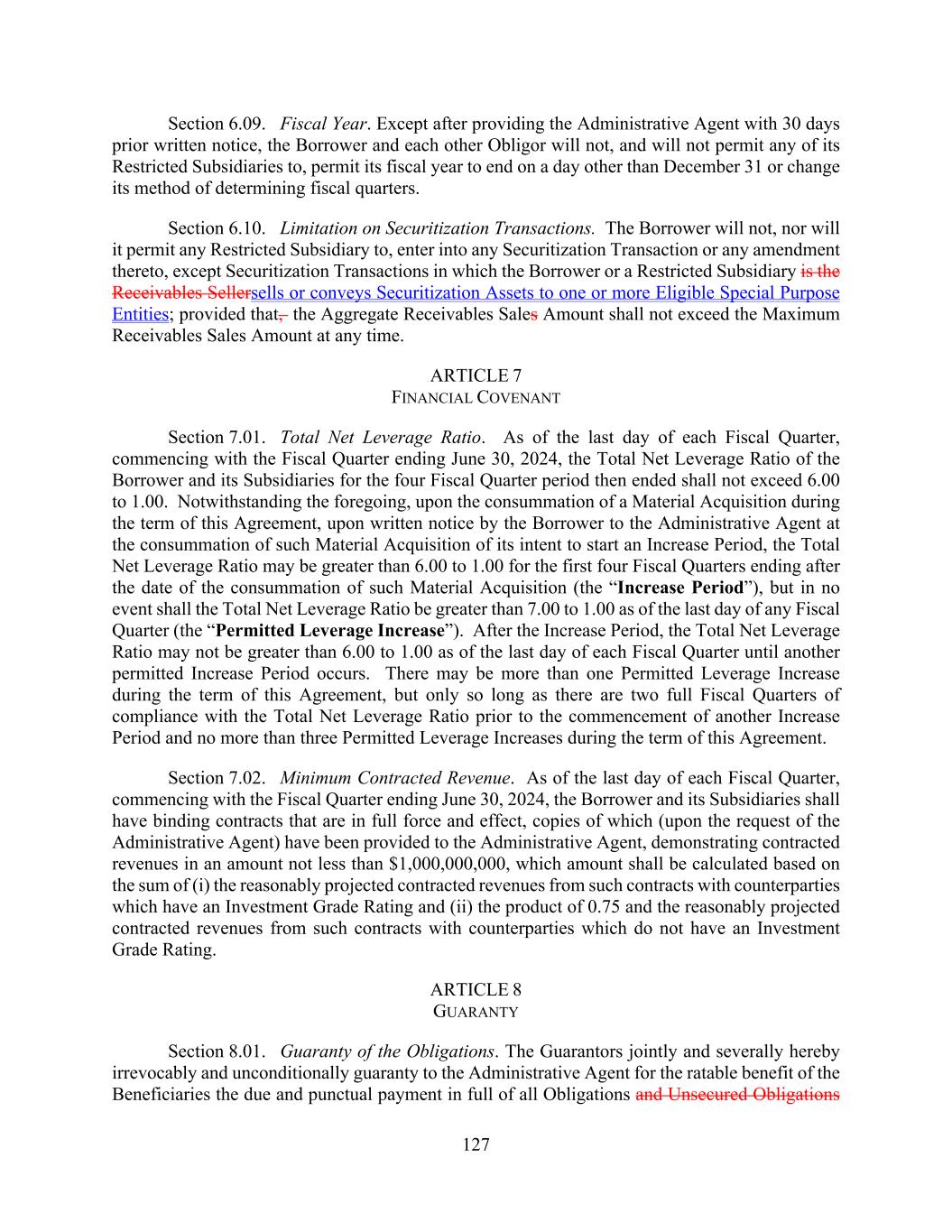 127 Section 6.09. Fiscal Year. Except after providing the Administrative Agent with 30 days prior written notice, the Borrower and each other Obligor will not, and will not permit any of its Restricted Subsidiaries to, permit its fiscal year to end on a day other than December 31 or change its method of determining fiscal quarters. Section 6.10. Limitation on Securitization Transactions. The Borrower will not, nor will it permit any Restricted Subsidiary to, enter into any Securitization Transaction or any amendment thereto, except Securitization Transactions in which the Borrower or a Restricted Subsidiary is the Receivables Sellersells or conveys Securitization Assets to one or more Eligible Special Purpose Entities; provided that, the Aggregate Receivables Sales Amount shall not exceed the Maximum Receivables Sales Amount at any time. ARTICLE 7 FINANCIAL COVENANT Section 7.01. Total Net Leverage Ratio. As of the last day of each Fiscal Quarter, commencing with the Fiscal Quarter ending June 30, 2024, the Total Net Leverage Ratio of the Borrower and its Subsidiaries for the four Fiscal Quarter period then ended shall not exceed 6.00 to 1.00. Notwithstanding the foregoing, upon the consummation of a Material Acquisition during the term of this Agreement, upon written notice by the Borrower to the Administrative Agent at the consummation of such Material Acquisition of its intent to start an Increase Period, the Total Net Leverage Ratio may be greater than 6.00 to 1.00 for the first four Fiscal Quarters ending after the date of the consummation of such Material Acquisition (the “Increase Period”), but in no event shall the Total Net Leverage Ratio be greater than 7.00 to 1.00 as of the last day of any Fiscal Quarter (the “Permitted Leverage Increase”). After the Increase Period, the Total Net Leverage Ratio may not be greater than 6.00 to 1.00 as of the last day of each Fiscal Quarter until another permitted Increase Period occurs. There may be more than one Permitted Leverage Increase during the term of this Agreement, but only so long as there are two full Fiscal Quarters of compliance with the Total Net Leverage Ratio prior to the commencement of another Increase Period and no more than three Permitted Leverage Increases during the term of this Agreement. Section 7.02. Minimum Contracted Revenue. As of the last day of each Fiscal Quarter, commencing with the Fiscal Quarter ending June 30, 2024, the Borrower and its Subsidiaries shall have binding contracts that are in full force and effect, copies of which (upon the request of the Administrative Agent) have been provided to the Administrative Agent, demonstrating contracted revenues in an amount not less than $1,000,000,000, which amount shall be calculated based on the sum of (i) the reasonably projected contracted revenues from such contracts with counterparties which have an Investment Grade Rating and (ii) the product of 0.75 and the reasonably projected contracted revenues from such contracts with counterparties which do not have an Investment Grade Rating. ARTICLE 8 GUARANTY Section 8.01. Guaranty of the Obligations. The Guarantors jointly and severally hereby irrevocably and unconditionally guaranty to the Administrative Agent for the ratable benefit of the Beneficiaries the due and punctual payment in full of all Obligations and Unsecured Obligations