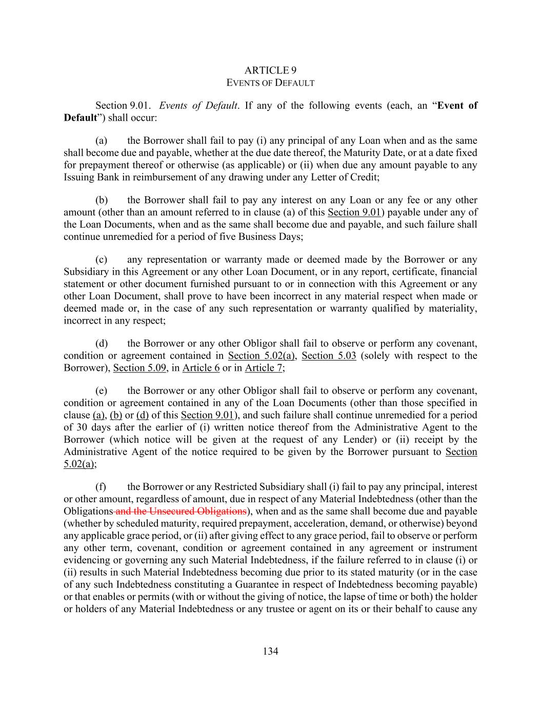 134 ARTICLE 9 EVENTS OF DEFAULT Section 9.01. Events of Default. If any of the following events (each, an “Event of Default”) shall occur: (a) the Borrower shall fail to pay (i) any principal of any Loan when and as the same shall become due and payable, whether at the due date thereof, the Maturity Date, or at a date fixed for prepayment thereof or otherwise (as applicable) or (ii) when due any amount payable to any Issuing Bank in reimbursement of any drawing under any Letter of Credit; (b) the Borrower shall fail to pay any interest on any Loan or any fee or any other amount (other than an amount referred to in clause (a) of this Section 9.01) payable under any of the Loan Documents, when and as the same shall become due and payable, and such failure shall continue unremedied for a period of five Business Days; (c) any representation or warranty made or deemed made by the Borrower or any Subsidiary in this Agreement or any other Loan Document, or in any report, certificate, financial statement or other document furnished pursuant to or in connection with this Agreement or any other Loan Document, shall prove to have been incorrect in any material respect when made or deemed made or, in the case of any such representation or warranty qualified by materiality, incorrect in any respect; (d) the Borrower or any other Obligor shall fail to observe or perform any covenant, condition or agreement contained in Section 5.02(a), Section 5.03 (solely with respect to the Borrower), Section 5.09, in Article 6 or in Article 7; (e) the Borrower or any other Obligor shall fail to observe or perform any covenant, condition or agreement contained in any of the Loan Documents (other than those specified in clause (a), (b) or (d) of this Section 9.01), and such failure shall continue unremedied for a period of 30 days after the earlier of (i) written notice thereof from the Administrative Agent to the Borrower (which notice will be given at the request of any Lender) or (ii) receipt by the Administrative Agent of the notice required to be given by the Borrower pursuant to Section 5.02(a); (f) the Borrower or any Restricted Subsidiary shall (i) fail to pay any principal, interest or other amount, regardless of amount, due in respect of any Material Indebtedness (other than the Obligations and the Unsecured Obligations), when and as the same shall become due and payable (whether by scheduled maturity, required prepayment, acceleration, demand, or otherwise) beyond any applicable grace period, or (ii) after giving effect to any grace period, fail to observe or perform any other term, covenant, condition or agreement contained in any agreement or instrument evidencing or governing any such Material Indebtedness, if the failure referred to in clause (i) or (ii) results in such Material Indebtedness becoming due prior to its stated maturity (or in the case of any such Indebtedness constituting a Guarantee in respect of Indebtedness becoming payable) or that enables or permits (with or without the giving of notice, the lapse of time or both) the holder or holders of any Material Indebtedness or any trustee or agent on its or their behalf to cause any