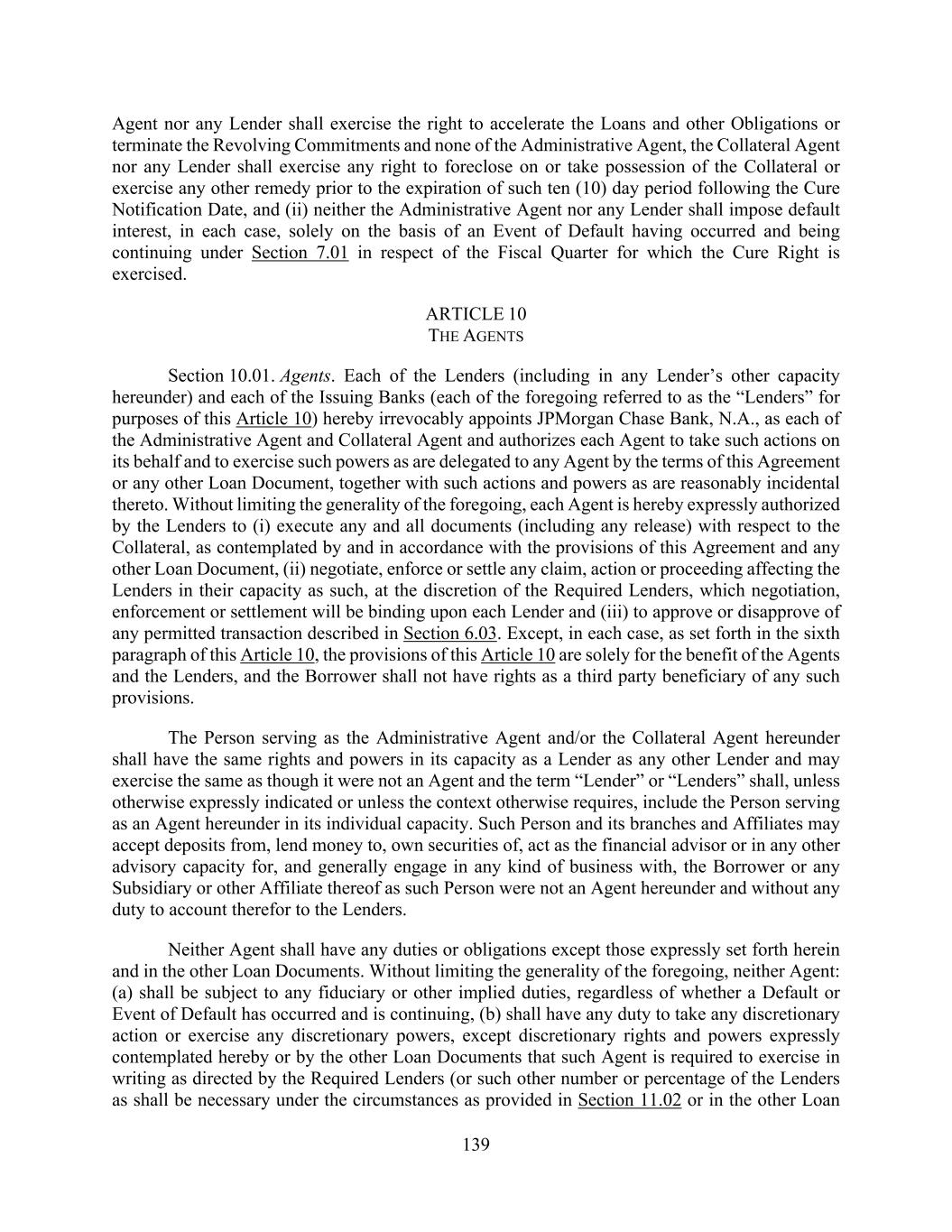 139 Agent nor any Lender shall exercise the right to accelerate the Loans and other Obligations or terminate the Revolving Commitments and none of the Administrative Agent, the Collateral Agent nor any Lender shall exercise any right to foreclose on or take possession of the Collateral or exercise any other remedy prior to the expiration of such ten (10) day period following the Cure Notification Date, and (ii) neither the Administrative Agent nor any Lender shall impose default interest, in each case, solely on the basis of an Event of Default having occurred and being continuing under Section 7.01 in respect of the Fiscal Quarter for which the Cure Right is exercised. ARTICLE 10 THE AGENTS Section 10.01. Agents. Each of the Lenders (including in any Lender’s other capacity hereunder) and each of the Issuing Banks (each of the foregoing referred to as the “Lenders” for purposes of this Article 10) hereby irrevocably appoints JPMorgan Chase Bank, N.A., as each of the Administrative Agent and Collateral Agent and authorizes each Agent to take such actions on its behalf and to exercise such powers as are delegated to any Agent by the terms of this Agreement or any other Loan Document, together with such actions and powers as are reasonably incidental thereto. Without limiting the generality of the foregoing, each Agent is hereby expressly authorized by the Lenders to (i) execute any and all documents (including any release) with respect to the Collateral, as contemplated by and in accordance with the provisions of this Agreement and any other Loan Document, (ii) negotiate, enforce or settle any claim, action or proceeding affecting the Lenders in their capacity as such, at the discretion of the Required Lenders, which negotiation, enforcement or settlement will be binding upon each Lender and (iii) to approve or disapprove of any permitted transaction described in Section 6.03. Except, in each case, as set forth in the sixth paragraph of this Article 10, the provisions of this Article 10 are solely for the benefit of the Agents and the Lenders, and the Borrower shall not have rights as a third party beneficiary of any such provisions. The Person serving as the Administrative Agent and/or the Collateral Agent hereunder shall have the same rights and powers in its capacity as a Lender as any other Lender and may exercise the same as though it were not an Agent and the term “Lender” or “Lenders” shall, unless otherwise expressly indicated or unless the context otherwise requires, include the Person serving as an Agent hereunder in its individual capacity. Such Person and its branches and Affiliates may accept deposits from, lend money to, own securities of, act as the financial advisor or in any other advisory capacity for, and generally engage in any kind of business with, the Borrower or any Subsidiary or other Affiliate thereof as such Person were not an Agent hereunder and without any duty to account therefor to the Lenders. Neither Agent shall have any duties or obligations except those expressly set forth herein and in the other Loan Documents. Without limiting the generality of the foregoing, neither Agent: (a) shall be subject to any fiduciary or other implied duties, regardless of whether a Default or Event of Default has occurred and is continuing, (b) shall have any duty to take any discretionary action or exercise any discretionary powers, except discretionary rights and powers expressly contemplated hereby or by the other Loan Documents that such Agent is required to exercise in writing as directed by the Required Lenders (or such other number or percentage of the Lenders as shall be necessary under the circumstances as provided in Section 11.02 or in the other Loan