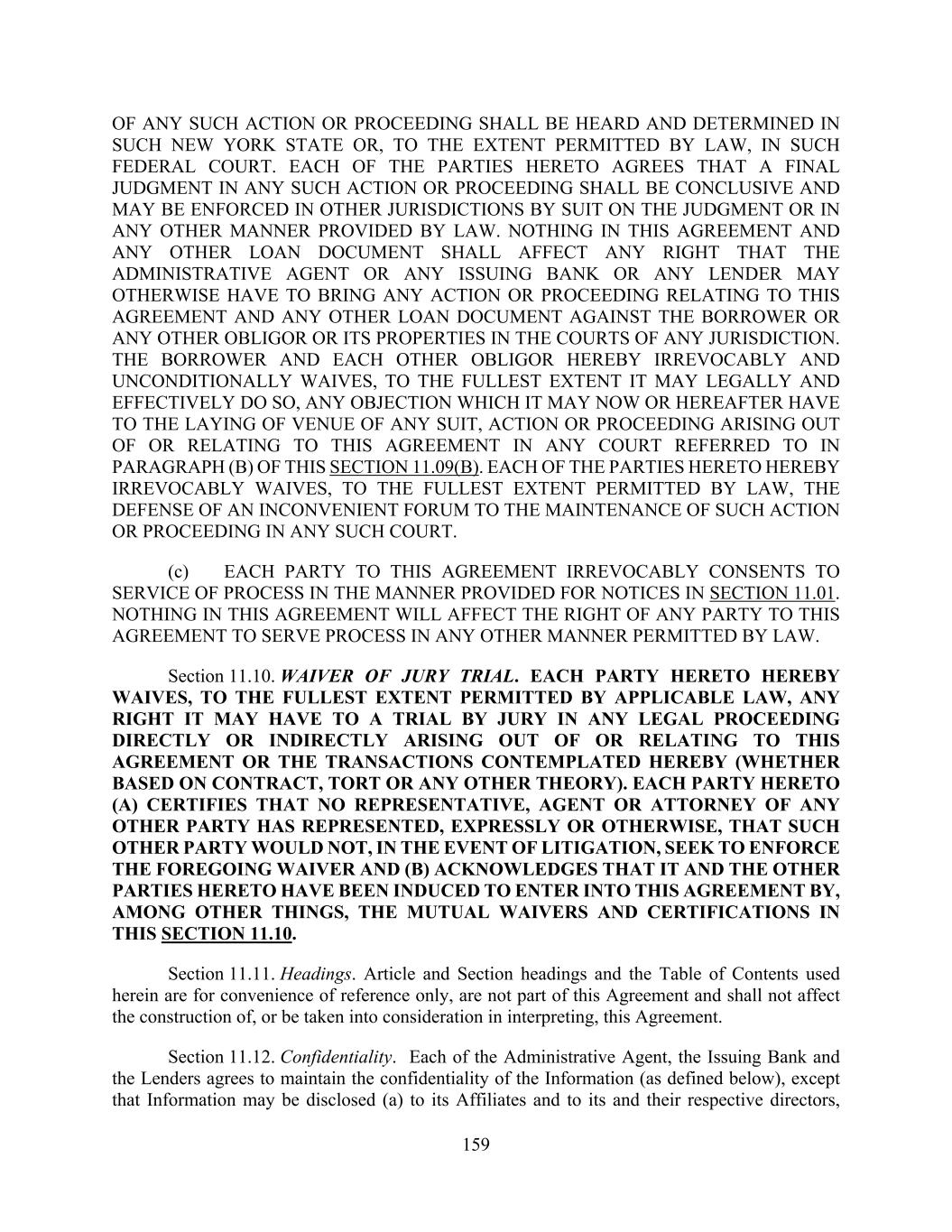 159 OF ANY SUCH ACTION OR PROCEEDING SHALL BE HEARD AND DETERMINED IN SUCH NEW YORK STATE OR, TO THE EXTENT PERMITTED BY LAW, IN SUCH FEDERAL COURT. EACH OF THE PARTIES HERETO AGREES THAT A FINAL JUDGMENT IN ANY SUCH ACTION OR PROCEEDING SHALL BE CONCLUSIVE AND MAY BE ENFORCED IN OTHER JURISDICTIONS BY SUIT ON THE JUDGMENT OR IN ANY OTHER MANNER PROVIDED BY LAW. NOTHING IN THIS AGREEMENT AND ANY OTHER LOAN DOCUMENT SHALL AFFECT ANY RIGHT THAT THE ADMINISTRATIVE AGENT OR ANY ISSUING BANK OR ANY LENDER MAY OTHERWISE HAVE TO BRING ANY ACTION OR PROCEEDING RELATING TO THIS AGREEMENT AND ANY OTHER LOAN DOCUMENT AGAINST THE BORROWER OR ANY OTHER OBLIGOR OR ITS PROPERTIES IN THE COURTS OF ANY JURISDICTION. THE BORROWER AND EACH OTHER OBLIGOR HEREBY IRREVOCABLY AND UNCONDITIONALLY WAIVES, TO THE FULLEST EXTENT IT MAY LEGALLY AND EFFECTIVELY DO SO, ANY OBJECTION WHICH IT MAY NOW OR HEREAFTER HAVE TO THE LAYING OF VENUE OF ANY SUIT, ACTION OR PROCEEDING ARISING OUT OF OR RELATING TO THIS AGREEMENT IN ANY COURT REFERRED TO IN PARAGRAPH (B) OF THIS SECTION 11.09(B). EACH OF THE PARTIES HERETO HEREBY IRREVOCABLY WAIVES, TO THE FULLEST EXTENT PERMITTED BY LAW, THE DEFENSE OF AN INCONVENIENT FORUM TO THE MAINTENANCE OF SUCH ACTION OR PROCEEDING IN ANY SUCH COURT. (c) EACH PARTY TO THIS AGREEMENT IRREVOCABLY CONSENTS TO SERVICE OF PROCESS IN THE MANNER PROVIDED FOR NOTICES IN SECTION 11.01. NOTHING IN THIS AGREEMENT WILL AFFECT THE RIGHT OF ANY PARTY TO THIS AGREEMENT TO SERVE PROCESS IN ANY OTHER MANNER PERMITTED BY LAW. Section 11.10. WAIVER OF JURY TRIAL. EACH PARTY HERETO HEREBY WAIVES, TO THE FULLEST EXTENT PERMITTED BY APPLICABLE LAW, ANY RIGHT IT MAY HAVE TO A TRIAL BY JURY IN ANY LEGAL PROCEEDING DIRECTLY OR INDIRECTLY ARISING OUT OF OR RELATING TO THIS AGREEMENT OR THE TRANSACTIONS CONTEMPLATED HEREBY (WHETHER BASED ON CONTRACT, TORT OR ANY OTHER THEORY). EACH PARTY HERETO (A) CERTIFIES THAT NO REPRESENTATIVE, AGENT OR ATTORNEY OF ANY OTHER PARTY HAS REPRESENTED, EXPRESSLY OR OTHERWISE, THAT SUCH OTHER PARTY WOULD NOT, IN THE EVENT OF LITIGATION, SEEK TO ENFORCE THE FOREGOING WAIVER AND (B) ACKNOWLEDGES THAT IT AND THE OTHER PARTIES HERETO HAVE BEEN INDUCED TO ENTER INTO THIS AGREEMENT BY, AMONG OTHER THINGS, THE MUTUAL WAIVERS AND CERTIFICATIONS IN THIS SECTION 11.10. Section 11.11. Headings. Article and Section headings and the Table of Contents used herein are for convenience of reference only, are not part of this Agreement and shall not affect the construction of, or be taken into consideration in interpreting, this Agreement. Section 11.12. Confidentiality. Each of the Administrative Agent, the Issuing Bank and the Lenders agrees to maintain the confidentiality of the Information (as defined below), except that Information may be disclosed (a) to its Affiliates and to its and their respective directors,