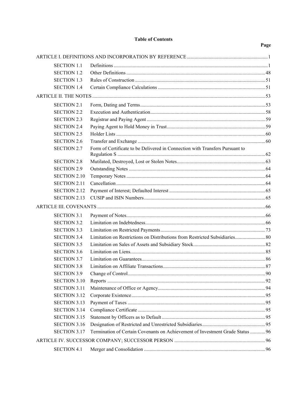 Table of Contents Page ARTICLE I. DEFINITIONS AND INCORPORATION BY REFERENCE ................................................................ 1 SECTION 1.1 Definitions .......................................................................................................................... 1 SECTION 1.2 Other Definitions .............................................................................................................. 48 SECTION 1.3 Rules of Construction ....................................................................................................... 51 SECTION 1.4 Certain Compliance Calculations ..................................................................................... 51 ARTICLE II. THE NOTES ......................................................................................................................................... 53 SECTION 2.1 Form, Dating and Terms ................................................................................................... 53 SECTION 2.2 Execution and Authentication ........................................................................................... 58 SECTION 2.3 Registrar and Paying Agent .............................................................................................. 59 SECTION 2.4 Paying Agent to Hold Money in Trust .............................................................................. 59 SECTION 2.5 Holder Lists ...................................................................................................................... 60 SECTION 2.6 Transfer and Exchange ..................................................................................................... 60 SECTION 2.7 Form of Certificate to be Delivered in Connection with Transfers Pursuant to Regulation S ..................................................................................................................... 62 SECTION 2.8 Mutilated, Destroyed, Lost or Stolen Notes ...................................................................... 63 SECTION 2.9 Outstanding Notes ............................................................................................................ 64 SECTION 2.10 Temporary Notes .............................................................................................................. 64 SECTION 2.11 Cancellation ...................................................................................................................... 64 SECTION 2.12 Payment of Interest; Defaulted Interest ............................................................................ 65 SECTION 2.13 CUSIP and ISIN Numbers ................................................................................................ 65 ARTICLE III. COVENANTS ..................................................................................................................................... 66 SECTION 3.1 Payment of Notes .............................................................................................................. 66 SECTION 3.2 Limitation on Indebtedness ............................................................................................... 66 SECTION 3.3 Limitation on Restricted Payments ................................................................................... 73 SECTION 3.4 Limitation on Restrictions on Distributions from Restricted Subsidiaries ........................ 80 SECTION 3.5 Limitation on Sales of Assets and Subsidiary Stock ......................................................... 82 SECTION 3.6 Limitation on Liens ........................................................................................................... 85 SECTION 3.7 Limitation on Guarantees.................................................................................................. 86 SECTION 3.8 Limitation on Affiliate Transactions ................................................................................. 87 SECTION 3.9 Change of Control ............................................................................................................. 90 SECTION 3.10 Reports ............................................................................................................................. 92 SECTION 3.11 Maintenance of Office or Agency ..................................................................................... 94 SECTION 3.12 Corporate Existence .......................................................................................................... 95 SECTION 3.13 Payment of Taxes ............................................................................................................. 95 SECTION 3.14 Compliance Certificate ..................................................................................................... 95 SECTION 3.15 Statement by Officers as to Default .................................................................................. 95 SECTION 3.16 Designation of Restricted and Unrestricted Subsidiaries .................................................. 95 SECTION 3.17 Termination of Certain Covenants on Achievement of Investment Grade Status ............ 96 ARTICLE IV. SUCCESSOR COMPANY; SUCCESSOR PERSON ........................................................................ 96 SECTION 4.1 Merger and Consolidation ................................................................................................ 96