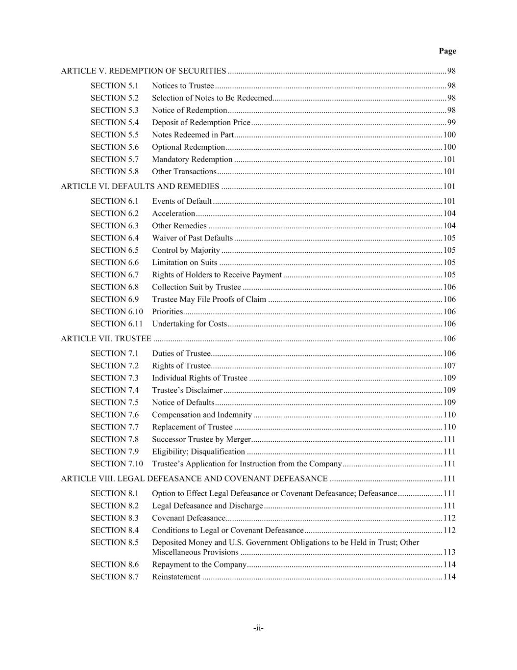 Page -ii- ARTICLE V. REDEMPTION OF SECURITIES ....................................................................................................... 98 SECTION 5.1 Notices to Trustee ............................................................................................................. 98 SECTION 5.2 Selection of Notes to Be Redeemed .................................................................................. 98 SECTION 5.3 Notice of Redemption ....................................................................................................... 98 SECTION 5.4 Deposit of Redemption Price ............................................................................................ 99 SECTION 5.5 Notes Redeemed in Part .................................................................................................. 100 SECTION 5.6 Optional Redemption ...................................................................................................... 100 SECTION 5.7 Mandatory Redemption .................................................................................................. 101 SECTION 5.8 Other Transactions .......................................................................................................... 101 ARTICLE VI. DEFAULTS AND REMEDIES ........................................................................................................ 101 SECTION 6.1 Events of Default ............................................................................................................ 101 SECTION 6.2 Acceleration .................................................................................................................... 104 SECTION 6.3 Other Remedies .............................................................................................................. 104 SECTION 6.4 Waiver of Past Defaults .................................................................................................. 105 SECTION 6.5 Control by Majority ........................................................................................................ 105 SECTION 6.6 Limitation on Suits ......................................................................................................... 105 SECTION 6.7 Rights of Holders to Receive Payment ........................................................................... 105 SECTION 6.8 Collection Suit by Trustee .............................................................................................. 106 SECTION 6.9 Trustee May File Proofs of Claim .................................................................................. 106 SECTION 6.10 Priorities.......................................................................................................................... 106 SECTION 6.11 Undertaking for Costs ..................................................................................................... 106 ARTICLE VII. TRUSTEE ........................................................................................................................................ 106 SECTION 7.1 Duties of Trustee............................................................................................................. 106 SECTION 7.2 Rights of Trustee............................................................................................................. 107 SECTION 7.3 Individual Rights of Trustee ........................................................................................... 109 SECTION 7.4 Trustee’s Disclaimer ....................................................................................................... 109 SECTION 7.5 Notice of Defaults ........................................................................................................... 109 SECTION 7.6 Compensation and Indemnity ......................................................................................... 110 SECTION 7.7 Replacement of Trustee .................................................................................................. 110 SECTION 7.8 Successor Trustee by Merger .......................................................................................... 111 SECTION 7.9 Eligibility; Disqualification ............................................................................................ 111 SECTION 7.10 Trustee’s Application for Instruction from the Company ............................................... 111 ARTICLE VIII. LEGAL DEFEASANCE AND COVENANT DEFEASANCE ..................................................... 111 SECTION 8.1 Option to Effect Legal Defeasance or Covenant Defeasance; Defeasance ..................... 111 SECTION 8.2 Legal Defeasance and Discharge .................................................................................... 111 SECTION 8.3 Covenant Defeasance ...................................................................................................... 112 SECTION 8.4 Conditions to Legal or Covenant Defeasance ................................................................. 112 SECTION 8.5 Deposited Money and U.S. Government Obligations to be Held in Trust; Other Miscellaneous Provisions ............................................................................................... 113 SECTION 8.6 Repayment to the Company ............................................................................................ 114 SECTION 8.7 Reinstatement ................................................................................................................. 114