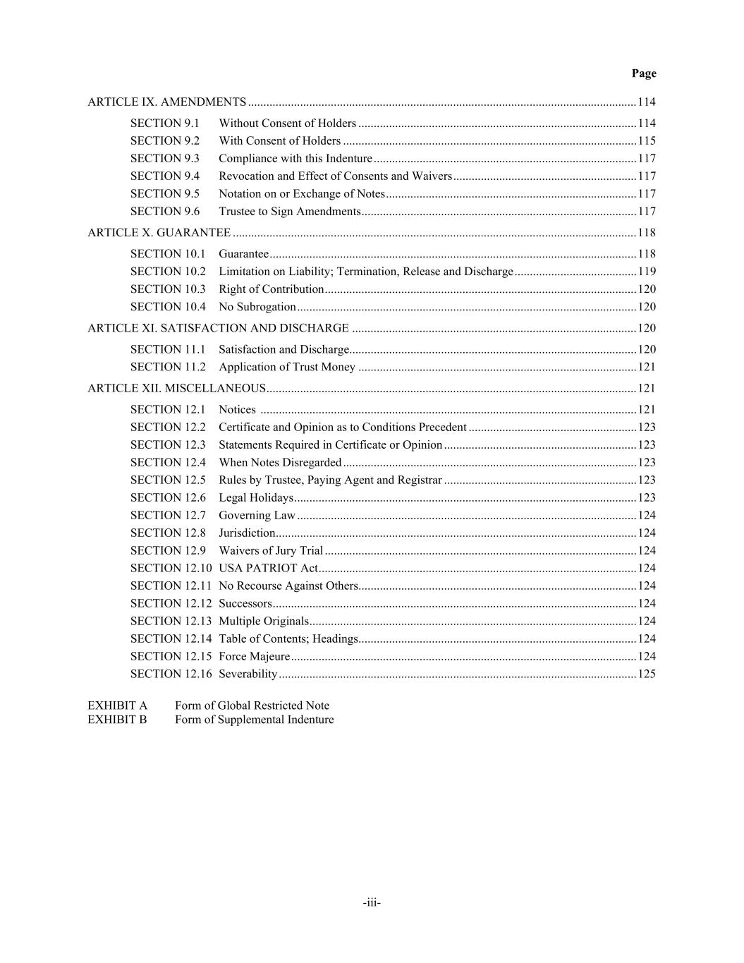 Page -iii- ARTICLE IX. AMENDMENTS ............................................................................................................................... 114 SECTION 9.1 Without Consent of Holders ........................................................................................... 114 SECTION 9.2 With Consent of Holders ................................................................................................ 115 SECTION 9.3 Compliance with this Indenture ...................................................................................... 117 SECTION 9.4 Revocation and Effect of Consents and Waivers ............................................................ 117 SECTION 9.5 Notation on or Exchange of Notes .................................................................................. 117 SECTION 9.6 Trustee to Sign Amendments .......................................................................................... 117 ARTICLE X. GUARANTEE .................................................................................................................................... 118 SECTION 10.1 Guarantee ........................................................................................................................ 118 SECTION 10.2 Limitation on Liability; Termination, Release and Discharge ........................................ 119 SECTION 10.3 Right of Contribution ...................................................................................................... 120 SECTION 10.4 No Subrogation ............................................................................................................... 120 ARTICLE XI. SATISFACTION AND DISCHARGE ............................................................................................. 120 SECTION 11.1 Satisfaction and Discharge .............................................................................................. 120 SECTION 11.2 Application of Trust Money ........................................................................................... 121 ARTICLE XII. MISCELLANEOUS ......................................................................................................................... 121 SECTION 12.1 Notices ........................................................................................................................... 121 SECTION 12.2 Certificate and Opinion as to Conditions Precedent ....................................................... 123 SECTION 12.3 Statements Required in Certificate or Opinion ............................................................... 123 SECTION 12.4 When Notes Disregarded ................................................................................................ 123 SECTION 12.5 Rules by Trustee, Paying Agent and Registrar ............................................................... 123 SECTION 12.6 Legal Holidays ................................................................................................................ 123 SECTION 12.7 Governing Law ............................................................................................................... 124 SECTION 12.8 Jurisdiction ...................................................................................................................... 124 SECTION 12.9 Waivers of Jury Trial ...................................................................................................... 124 SECTION 12.10 USA PATRIOT Act ........................................................................................................ 124 SECTION 12.11 No Recourse Against Others ........................................................................................... 124 SECTION 12.12 Successors ....................................................................................................................... 124 SECTION 12.13 Multiple Originals ........................................................................................................... 124 SECTION 12.14 Table of Contents; Headings ........................................................................................... 124 SECTION 12.15 Force Majeure ................................................................................................................. 124 SECTION 12.16 Severability ..................................................................................................................... 125 EXHIBIT A Form of Global Restricted Note EXHIBIT B Form of Supplemental Indenture