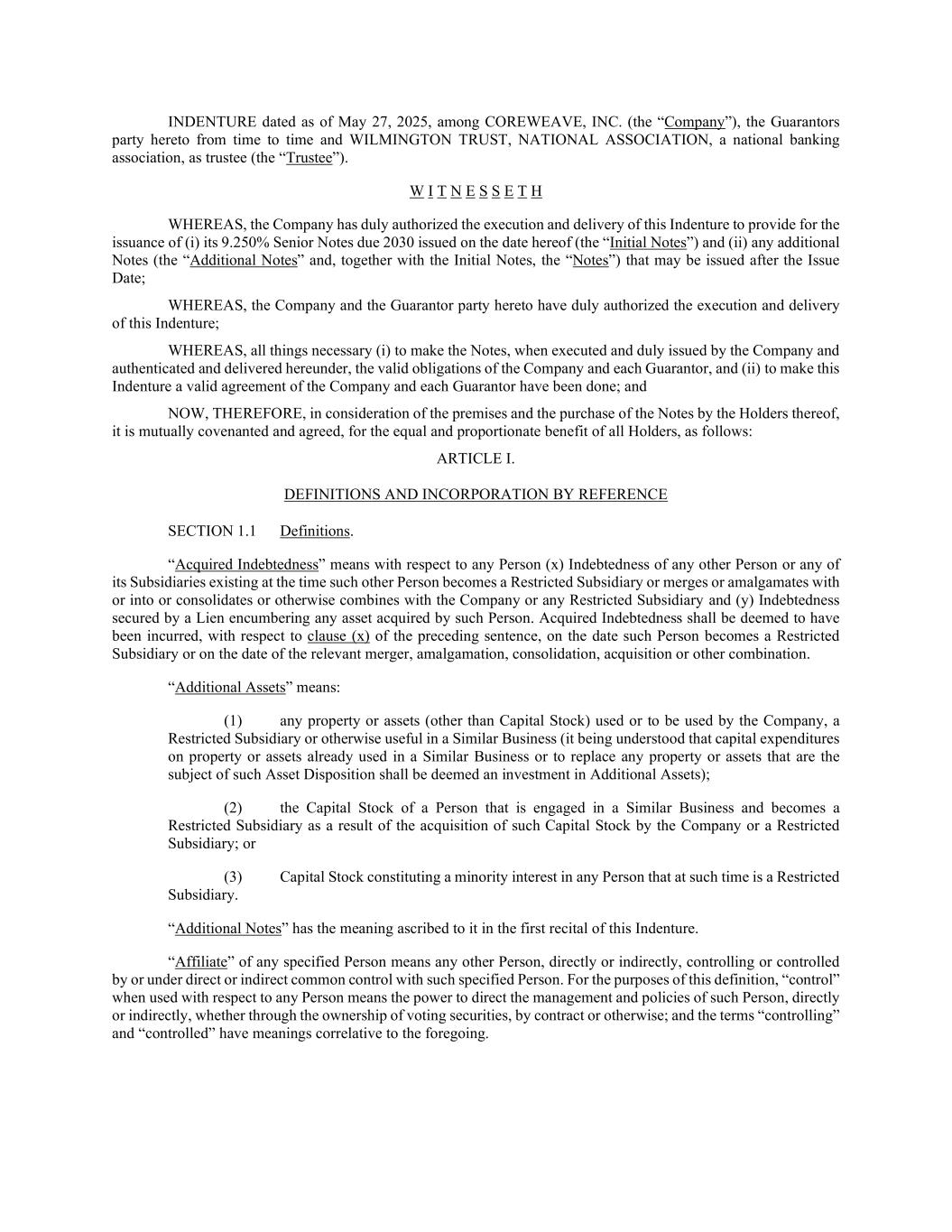 INDENTURE dated as of May 27, 2025, among COREWEAVE, INC. (the “Company”), the Guarantors party hereto from time to time and WILMINGTON TRUST, NATIONAL ASSOCIATION, a national banking association, as trustee (the “Trustee”). W I T N E S S E T H WHEREAS, the Company has duly authorized the execution and delivery of this Indenture to provide for the issuance of (i) its 9.250% Senior Notes due 2030 issued on the date hereof (the “Initial Notes”) and (ii) any additional Notes (the “Additional Notes” and, together with the Initial Notes, the “Notes”) that may be issued after the Issue Date; WHEREAS, the Company and the Guarantor party hereto have duly authorized the execution and delivery of this Indenture; WHEREAS, all things necessary (i) to make the Notes, when executed and duly issued by the Company and authenticated and delivered hereunder, the valid obligations of the Company and each Guarantor, and (ii) to make this Indenture a valid agreement of the Company and each Guarantor have been done; and NOW, THEREFORE, in consideration of the premises and the purchase of the Notes by the Holders thereof, it is mutually covenanted and agreed, for the equal and proportionate benefit of all Holders, as follows: ARTICLE I. DEFINITIONS AND INCORPORATION BY REFERENCE SECTION 1.1 Definitions. “Acquired Indebtedness” means with respect to any Person (x) Indebtedness of any other Person or any of its Subsidiaries existing at the time such other Person becomes a Restricted Subsidiary or merges or amalgamates with or into or consolidates or otherwise combines with the Company or any Restricted Subsidiary and (y) Indebtedness secured by a Lien encumbering any asset acquired by such Person. Acquired Indebtedness shall be deemed to have been incurred, with respect to clause (x) of the preceding sentence, on the date such Person becomes a Restricted Subsidiary or on the date of the relevant merger, amalgamation, consolidation, acquisition or other combination. “Additional Assets” means: (1) any property or assets (other than Capital Stock) used or to be used by the Company, a Restricted Subsidiary or otherwise useful in a Similar Business (it being understood that capital expenditures on property or assets already used in a Similar Business or to replace any property or assets that are the subject of such Asset Disposition shall be deemed an investment in Additional Assets); (2) the Capital Stock of a Person that is engaged in a Similar Business and becomes a Restricted Subsidiary as a result of the acquisition of such Capital Stock by the Company or a Restricted Subsidiary; or (3) Capital Stock constituting a minority interest in any Person that at such time is a Restricted Subsidiary. “Additional Notes” has the meaning ascribed to it in the first recital of this Indenture. “Affiliate” of any specified Person means any other Person, directly or indirectly, controlling or controlled by or under direct or indirect common control with such specified Person. For the purposes of this definition, “control” when used with respect to any Person means the power to direct the management and policies of such Person, directly or indirectly, whether through the ownership of voting securities, by contract or otherwise; and the terms “controlling” and “controlled” have meanings correlative to the foregoing.